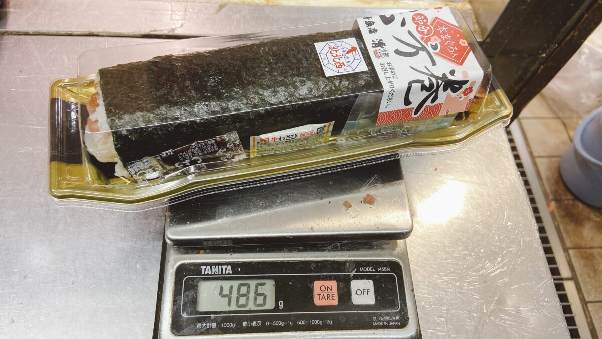 ボリューム感のある恵方巻です。スケールで測っていただきました。重さは、なんと……!