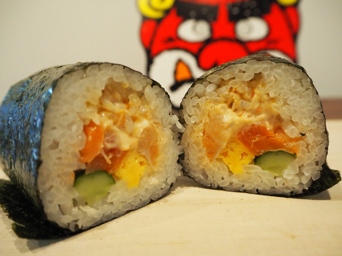 ・丸かぶりすると2種類の味の違いがよくわからないものの、おそらく醤油マヨネーズソース和えのサーモンからの塩気が結構強くて、マヨネーズの甘さだけでなくハッキリした味わいで美味しい!サーモンも結構なボリュームで入っているし、カニフレークまで入っていて満足感高いです!(30代男子・取締役)
