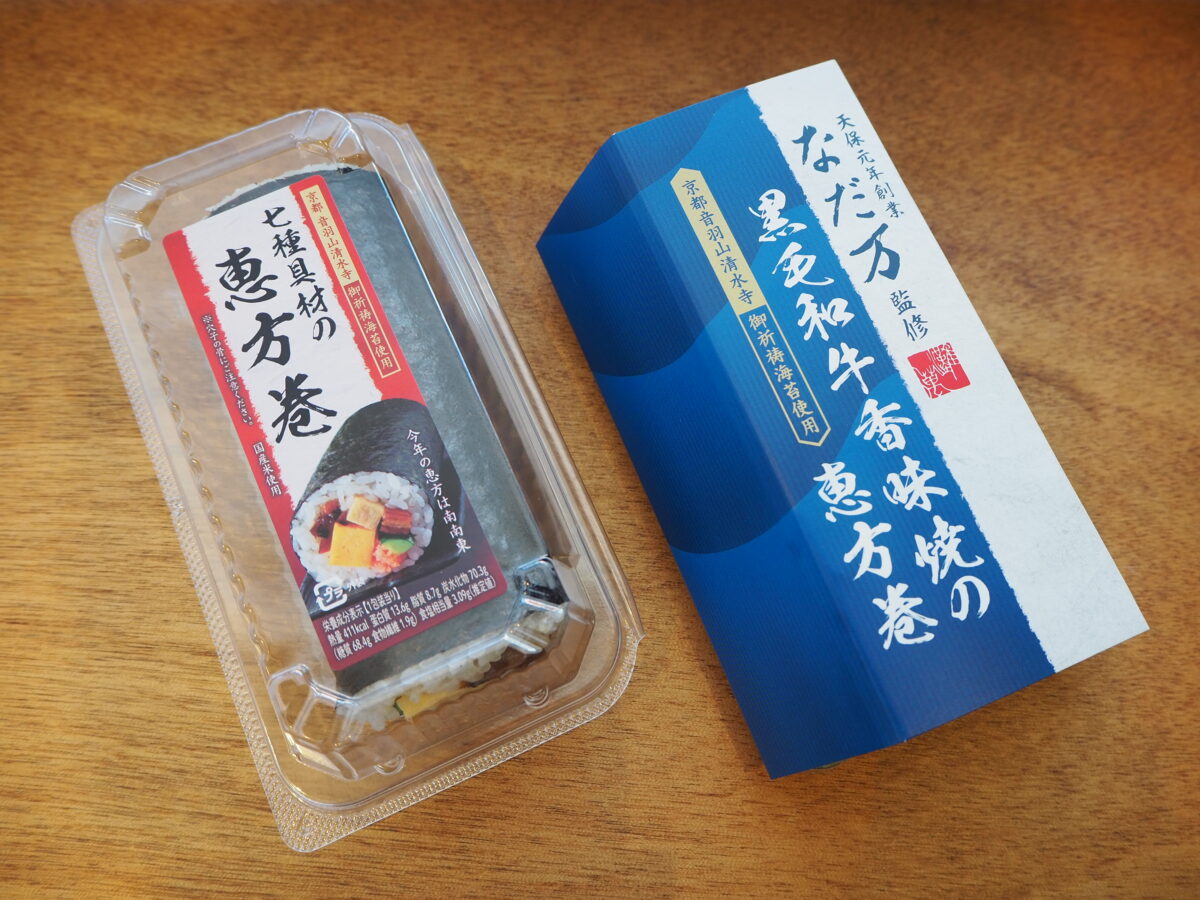 続いてはローソンの「七種具材の恵方巻」と「なだ万監修 黒毛和牛香味焼の恵方巻」の2種を実食!