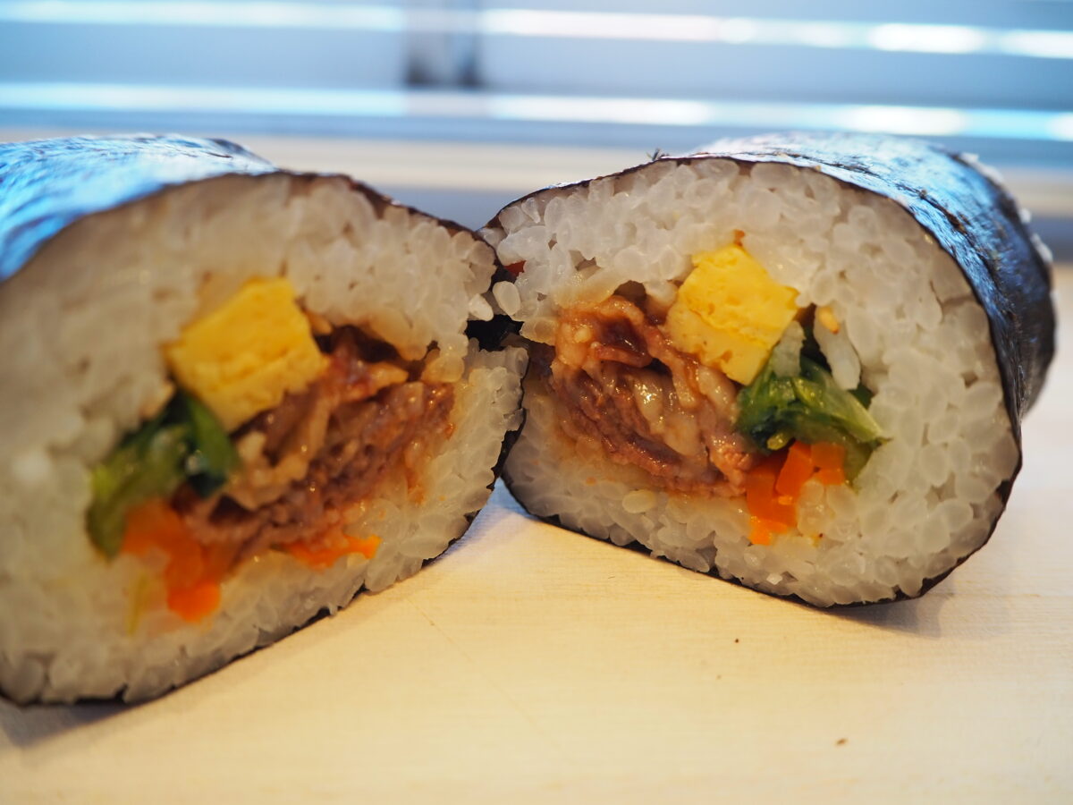具は厚焼き玉子・焼き穴子・高野豆腐・きゅうり・椎茸・おぼろ・かんぴょうとオーソドックスで間違いのないラインナップ。断面を見た感じだと、厚焼き玉子がメインとなっている印象です。