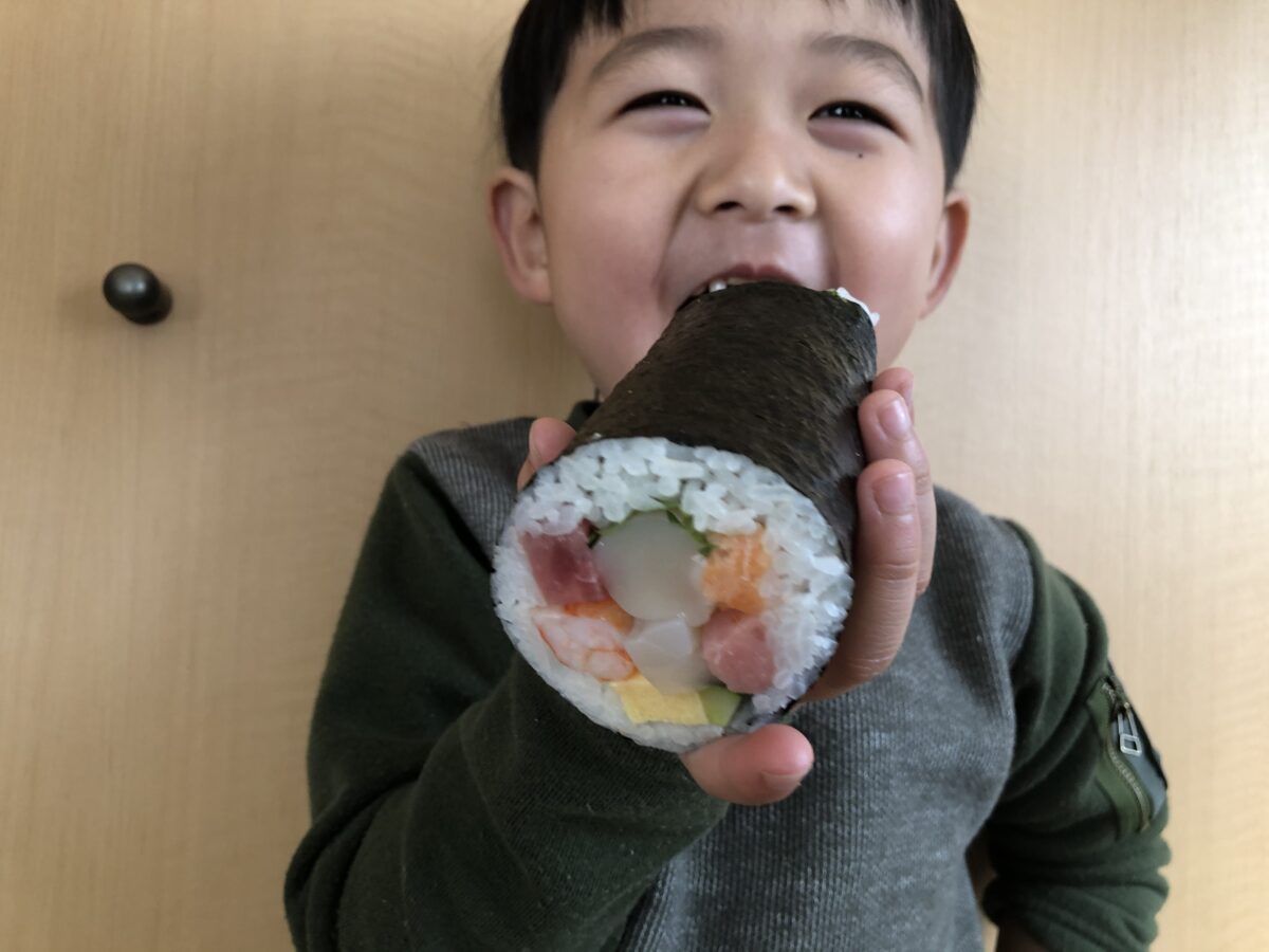 事前にハーフにカットして恵方巻を、4歳児の息子も実食。途中で水分補給をしつつも、一気に完食することができました。「玉子と桃色のが美味しい」とのこと。玉子焼きと桃色のおぼろは、子どもが大好きな味のようです。