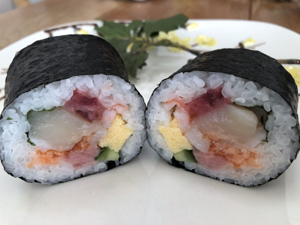 こちらの恵方巻は、7種の海鮮が入った豪華海鮮恵方巻。目玉はやはり北海道産のホタテです。ホタテの柔らかさ、イカの歯ごたえ、とびっこの食感、まぐろやサーモンのたたきの濃厚な旨味、その他の具材もほどよく相まって、抜群に美味しい海鮮恵方巻ができあがっています。ほんのり感じる紫蘇の風味もGOOD!40代夫は、小皿にわさびを溶かした醤油を準備し、昼ビールと合わせて、味を楽しんでおりました。