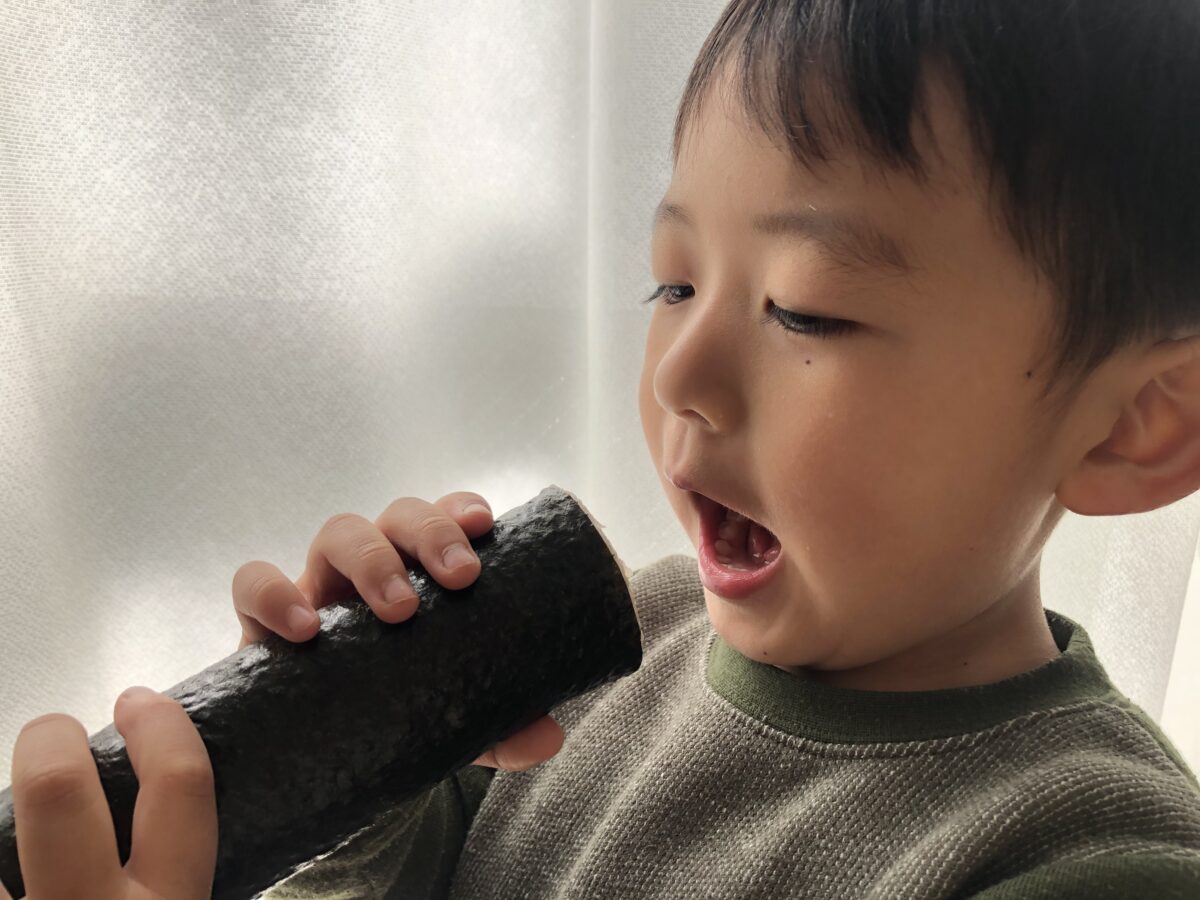 事前にハーフにカットして恵方巻を、4歳児の息子も実食。途中で水分補給をしつつも、一気に完食することができました。「玉子と桃色のが美味しい」とのこと。玉子焼きと桃色のおぼろは、子どもが大好きな味のようです。
