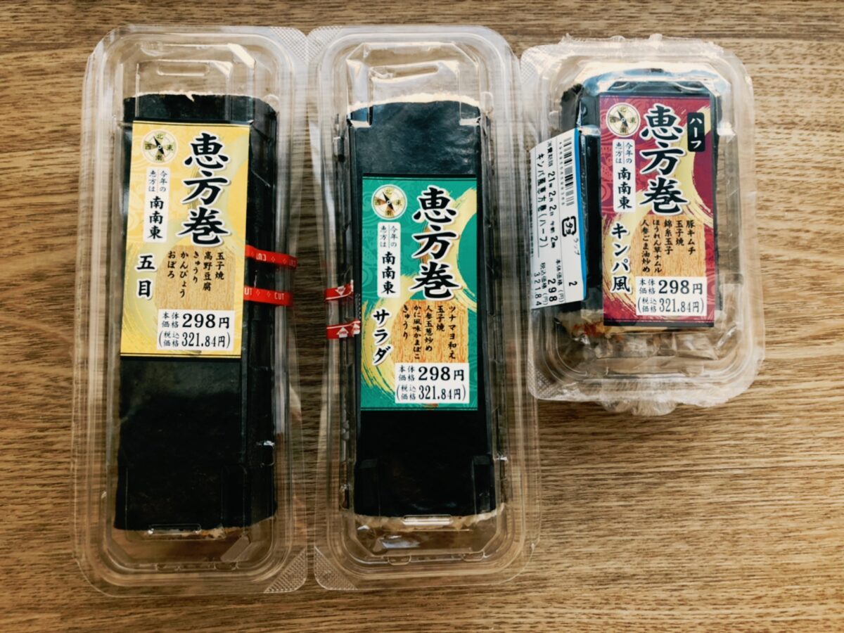 まいばすけっとの恵方巻は、手頃な統一価格でいろいろな味を選ぶ楽しさがたくさんで、楽しい節分を迎えることができました。手頃に恵方巻を楽しみたい方は、是非まいばすけっとをチェックしてみて下さい。