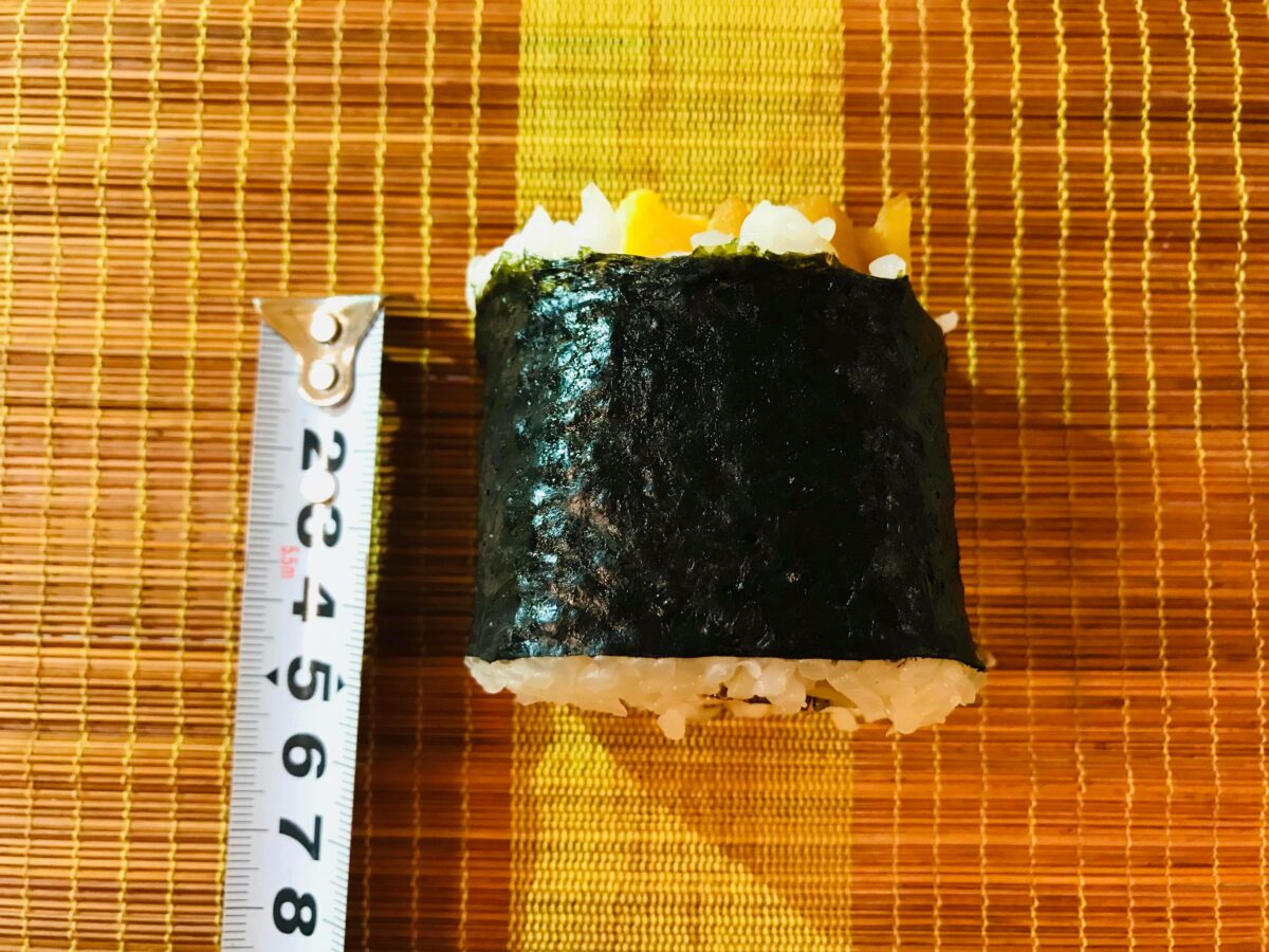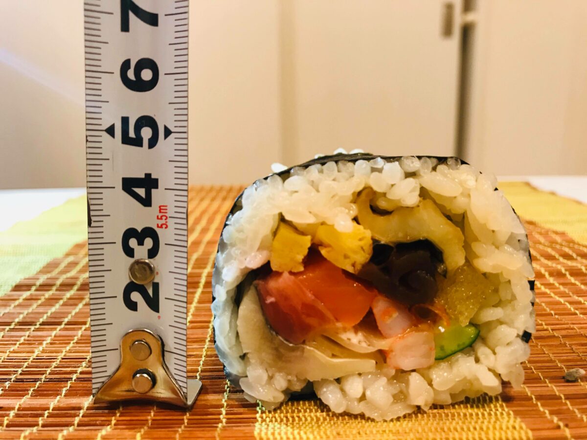 半分に切ってみると、きれいに厚焼き玉子が顔を覗かせてくれます!具材面積の半分以上が厚焼き玉子と言うインパクトがすごい!なお大きさは「一番人気!豊漁八宝海鮮巻」と一緒で、長さ18cm、直径5cmです。