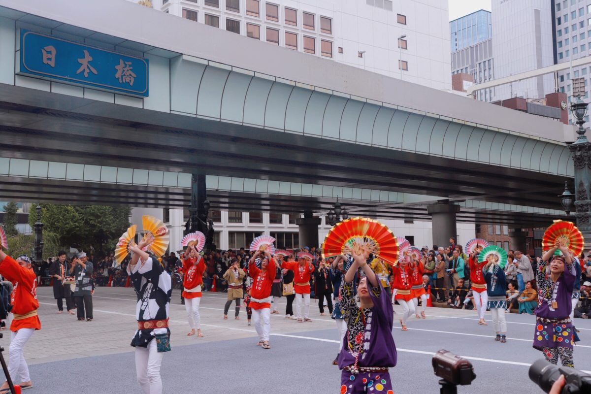 昭和47年(1972年)に国道完成記念としてパレードが開催されたことが始まりで、以降毎年10月下旬頃に開催されている「日本橋京橋まつり」は、日本全国から集まった多くの団体が、日本橋・京橋エリアの中心である中央通りを、活気溢れる伝統的な踊りによって賑やかにしてくれます。