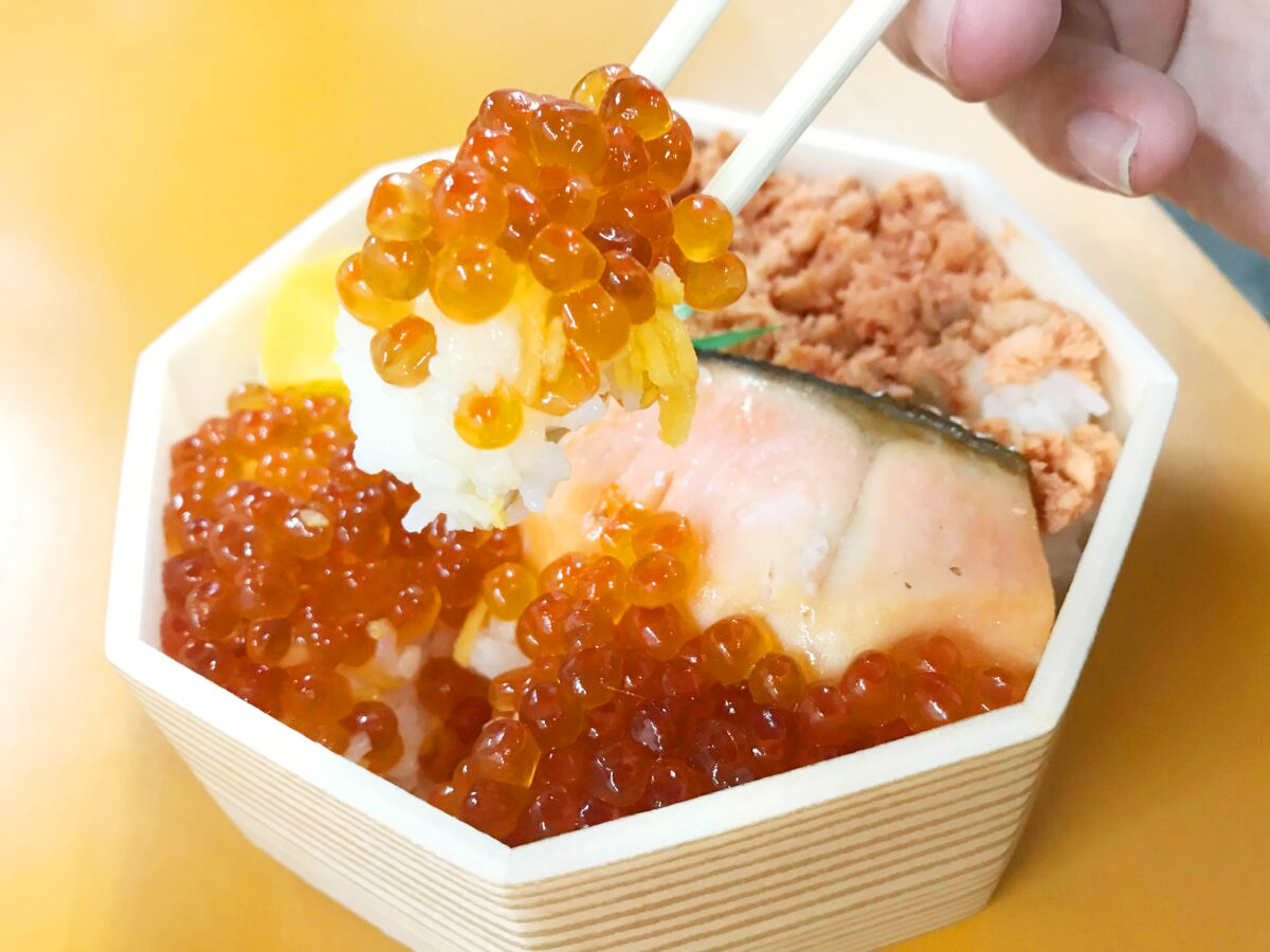 最初にご紹介する「鮭はらこ弁当」は、ご飯の上に鮭といくらの親子がどっさり乗ったお弁当!