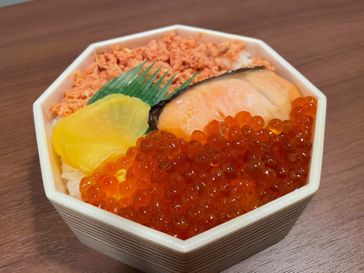 白いご飯の上に、鮭フレークと鮭漬焼、いくら醤油漬がどっさり!