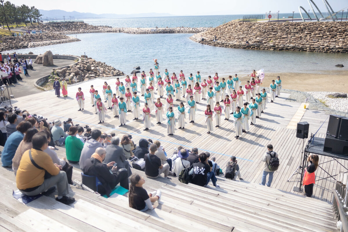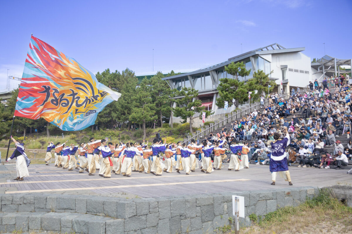 他にもゑぇじゃないか祭りならではの特徴的な会場があります。それは特に人気が高い「石舞台会場」です。「海への道会場」を超えた先、海を見渡せる展望広場に舞台が用意されています。奥にはりんくうパークのシンボル「LOVE RINKu」のモニュメント、さらにその背後には関西国際空港を望むことができる抜群のロケーション観客席は、階段状になっているため観客としてもゆっくりと演舞を楽しむことができるのでオススメの会場です。