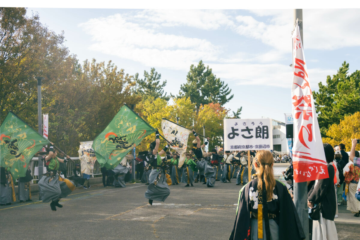 よさ朗は同志社大学の学生で構成されているチームですが、関西で高知系の学生チームといえば?と言われると最初に名前が挙がる歴史も実力もあるチームです。よく揃った踊り、鳴子の音、素敵な笑顔、どれをとっても魅力的で会場の両サイドのお客さんを楽しませてくれました。