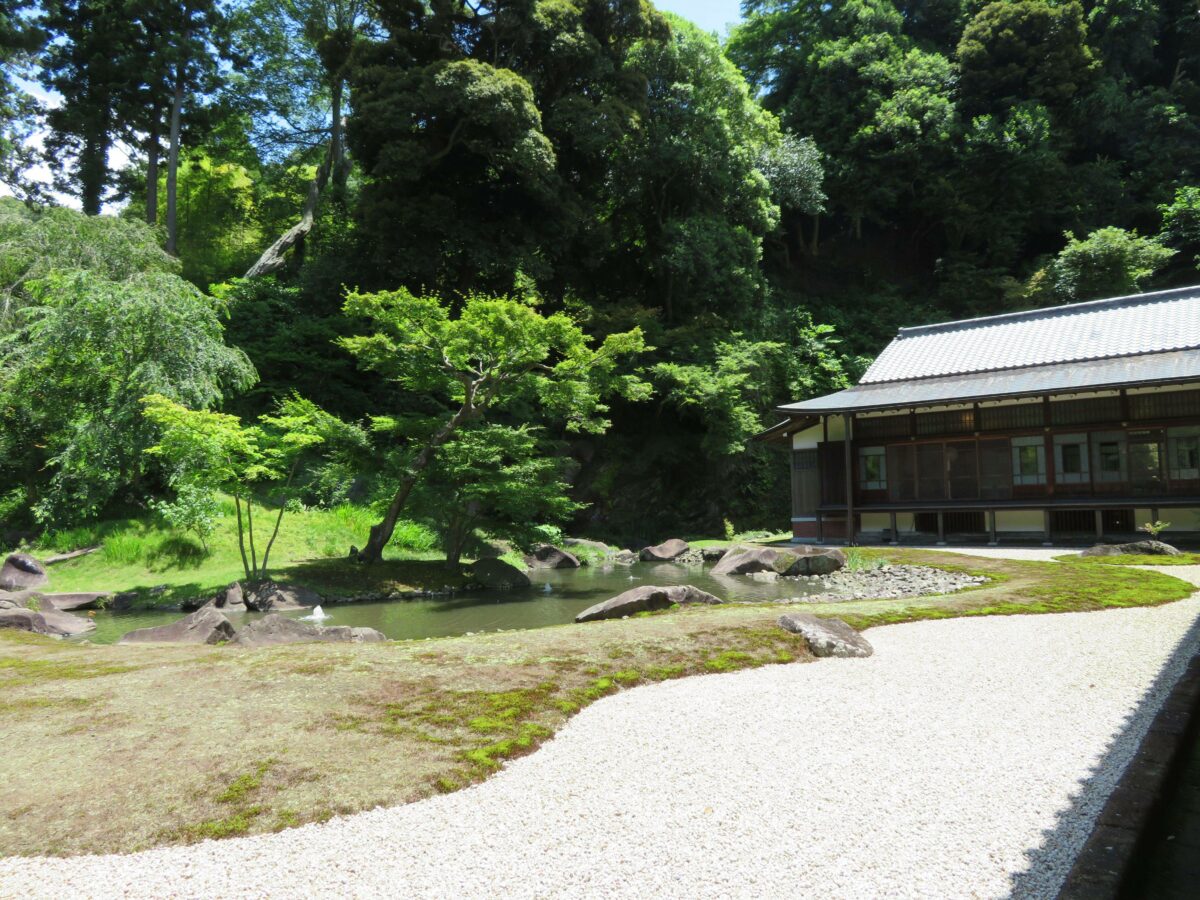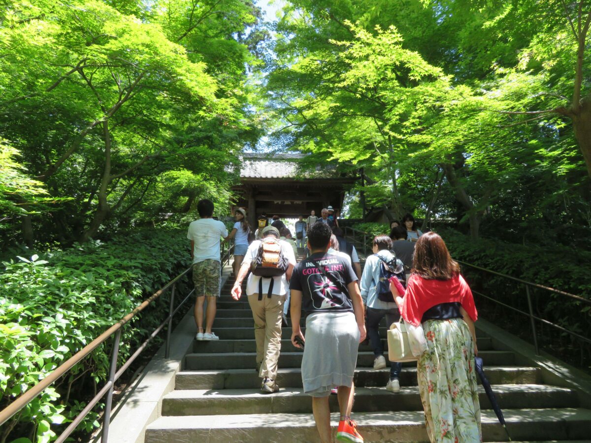 円覚寺は鎌倉幕府第8代執権の北条時宗が、1282年に元寇による犠牲者を敵味方の区別なく平等に弔うために創建しました。JR横須賀線の北鎌倉駅から線路沿いに繋がる馬道が寺院に導いてくれます。