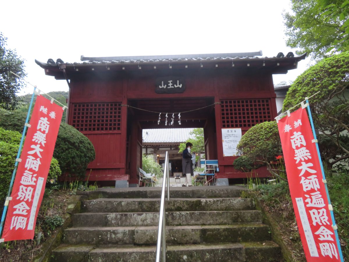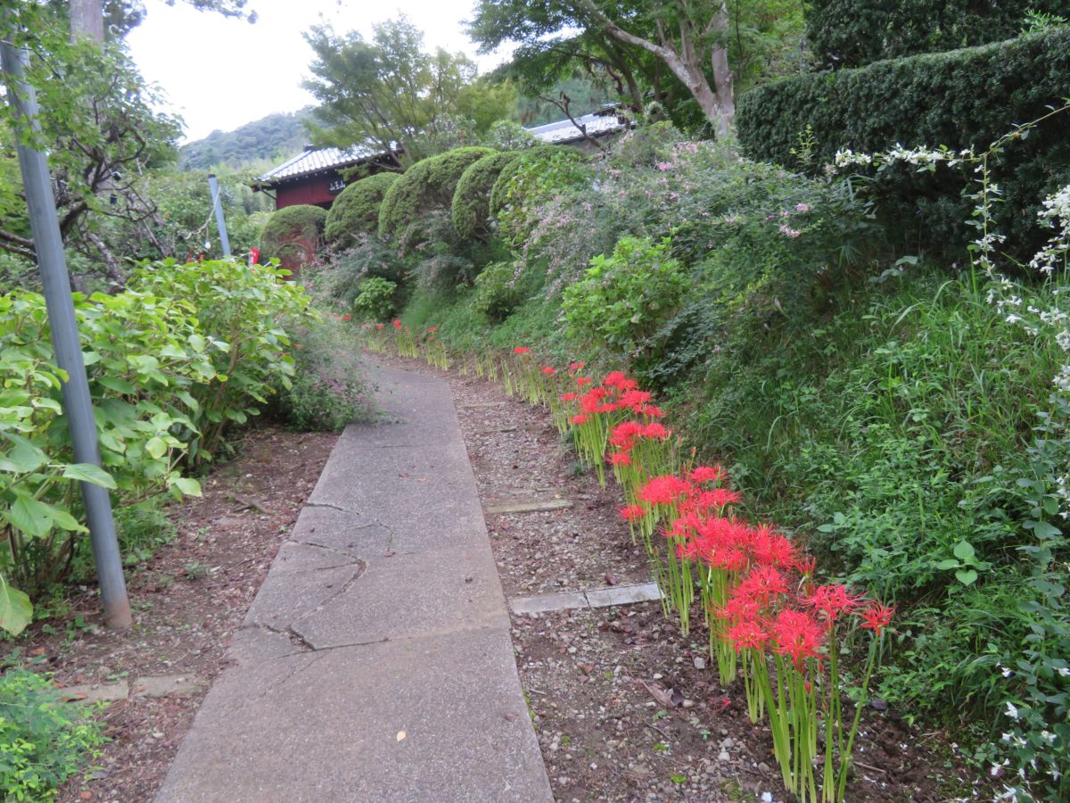 円如寺の境内に向かう坂道の西側には、萩の畑となっており、何層にも重なる萩の花越しに仁王門が堂々とした姿を見せています。坂道から仁王門に繋がる小道では彼岸花が異なる彩りで出迎えてくれます。