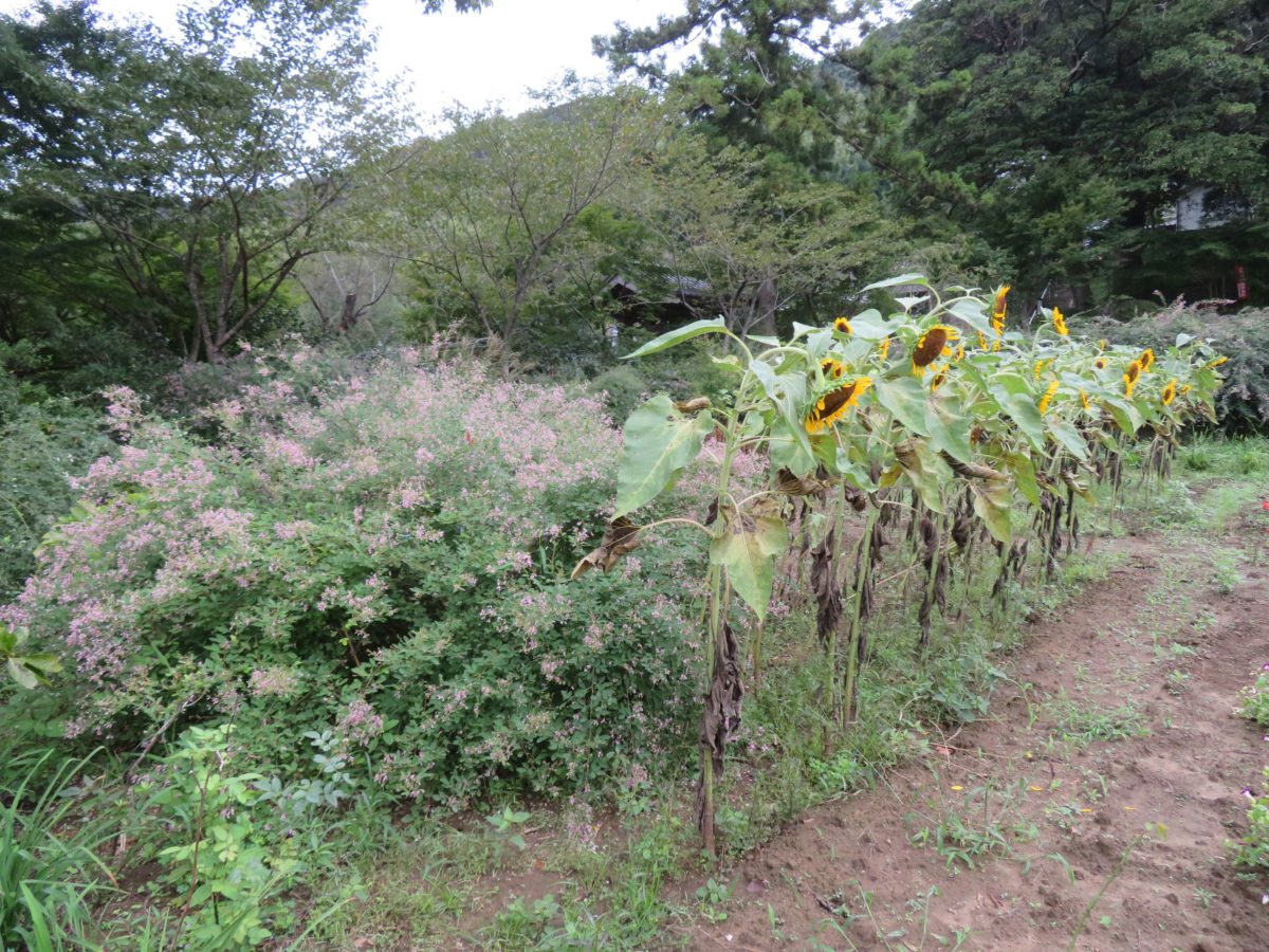 萩の花越しに見る円如寺の姿は見事ですが、逆に仁王門から萩の花越しに見える久留里の集落も見逃せないものでしょう。萩の畑の西の端には夏の花の王様ヒマワリが咲き、季節の移り変わりを実感することができます。