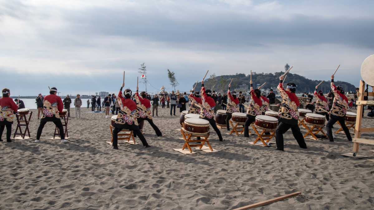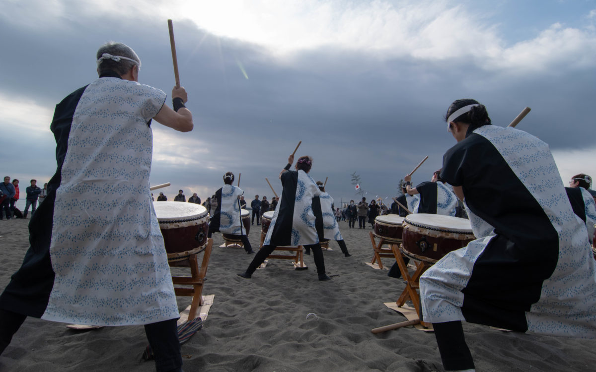 曇り空の下、砂浜に鳴り響く和太鼓の音
