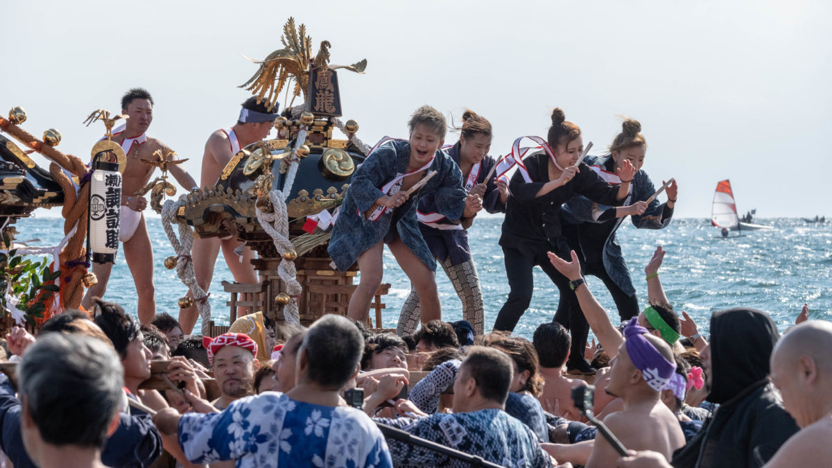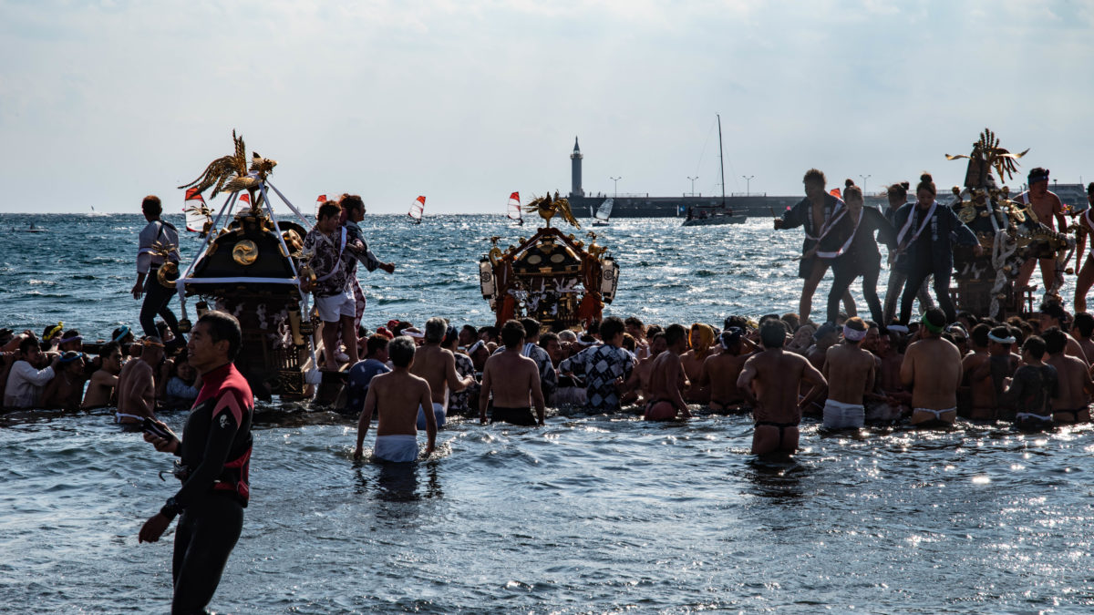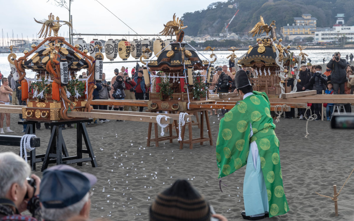 相模湾を囲む湘南地域一帯では神輿が海に入っていく祭りが多くあります。有名な茅ヶ崎の「浜降祭」をはじめ大小ありますが、殆どが夏の祭りシーズンに行われるもので、湘南地域で冬の海に神輿が入っていくのは、大磯元旦寒中神輿と、ここ江ノ島だけのようです。