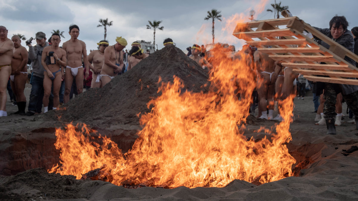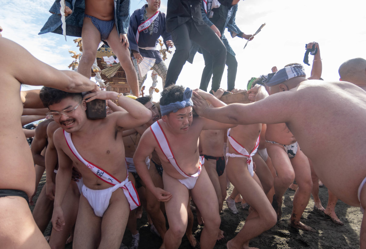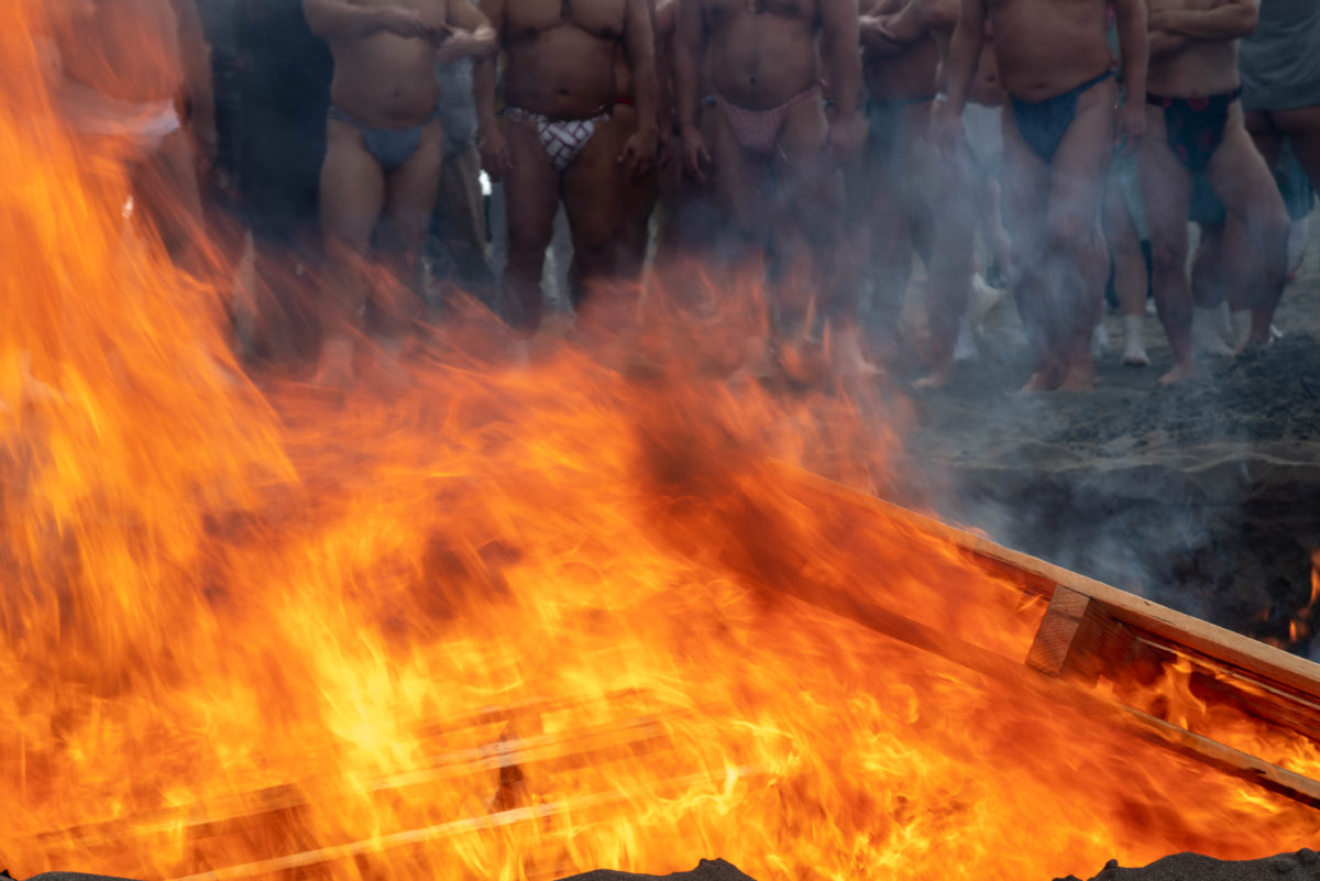 砂浜に掘った穴に、暖を取るための焚火が用意されます。式典の間にまだかまだかと集まってくる褌姿の担ぎ手達。