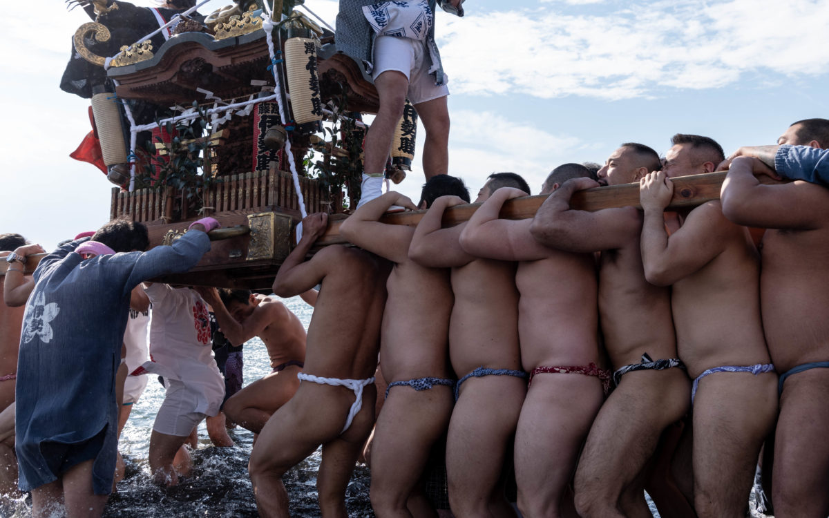 筆者は膝上まである長靴を履いて撮影に臨みましたが、神輿につられてザブザブと海へ・・・始まって数秒で既に長靴の中までびっちょり!レンズにも水しぶきがー