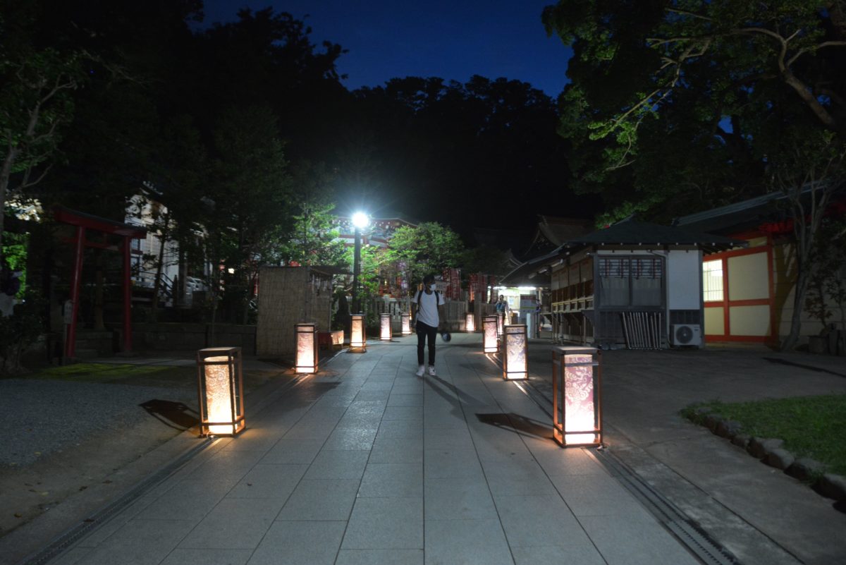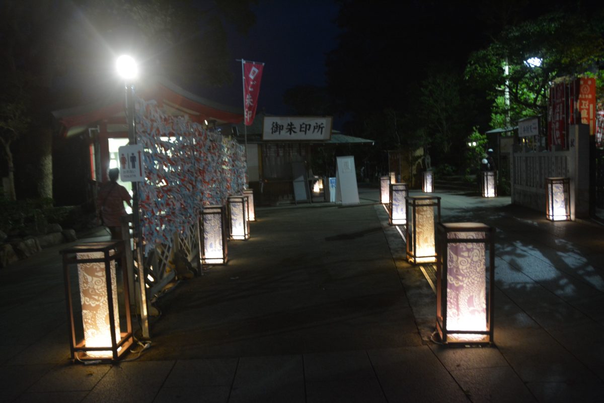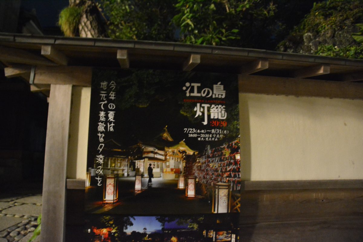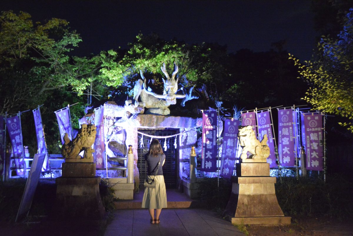 灯篭の光で照らされる江島神社の3つの宮と参道