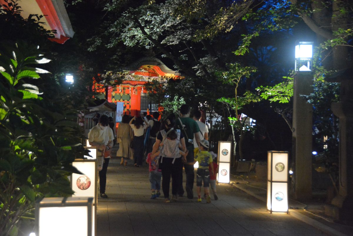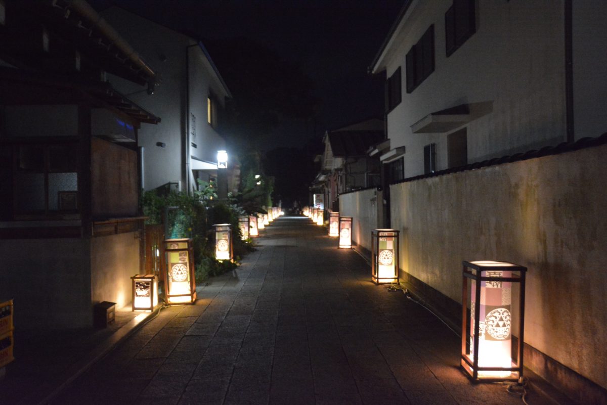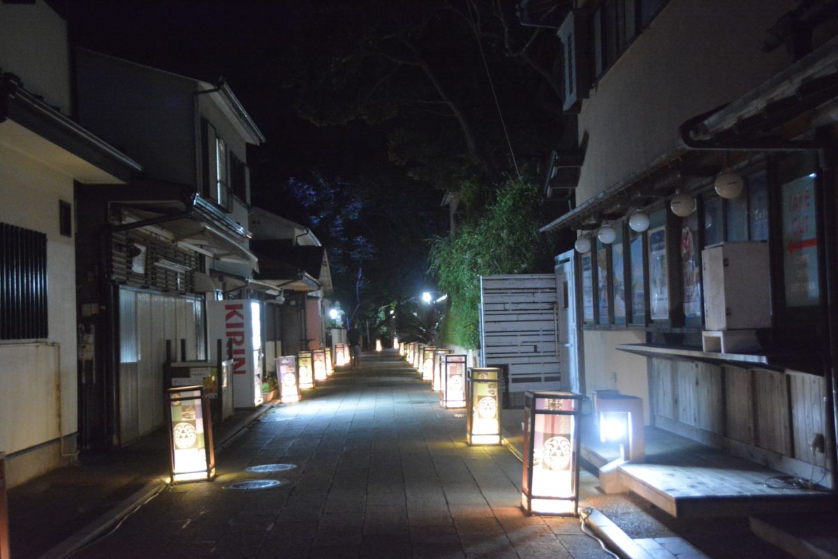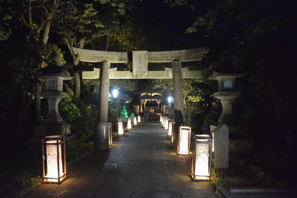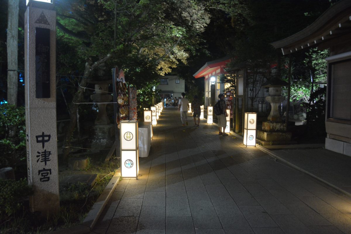 灯篭の光で照らされる江島神社の3つの宮と参道