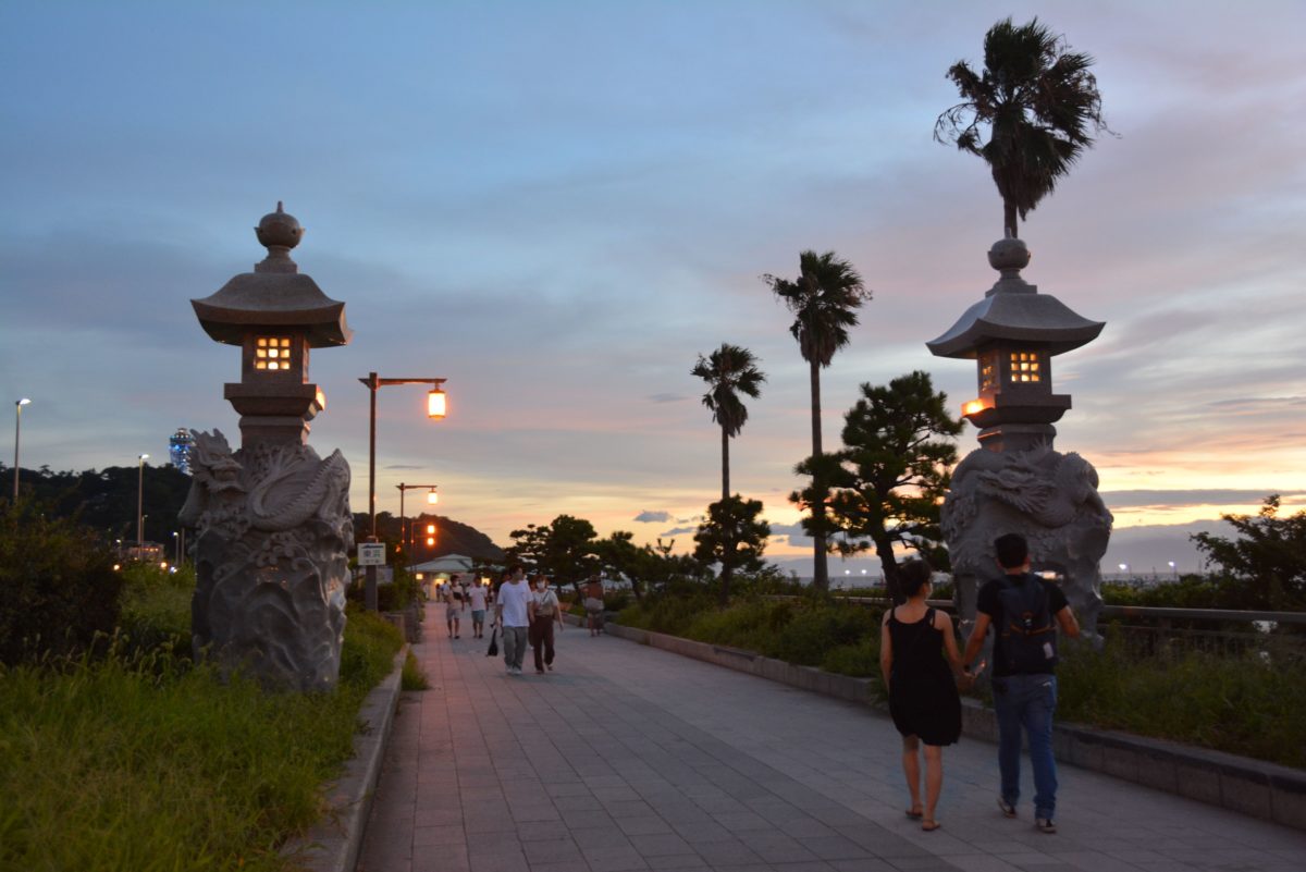 神奈川県の茅ヶ崎市から鎌倉市にいたる相模湾の海岸線は湘南海岸と呼ばれ、夏には海水浴やサーフィンなどのマリーンスポーツを楽しむ人々で賑わいます。湘南海岸のほぼ中央の藤沢市で相模湾に突き出した陸繋島の江の島は、「天女と五頭龍」の伝説が語られ、アウトドアレジャーばかりでなく歴史的な情緒が溢れる観光スポットです。例年7月下旬から8月下旬までの夜間には、島のいたるところで灯篭から柔らかな光を放ち、幻想的な雰囲気に包まれます。2020年は新型コロナ感染拡大防止のためイベントは中止となりましたが、7月23日~8月31日の期間で「江の島灯籠」が行われています。