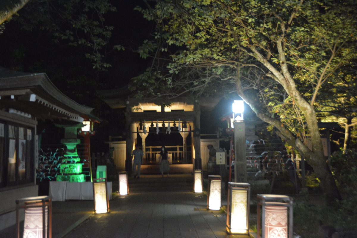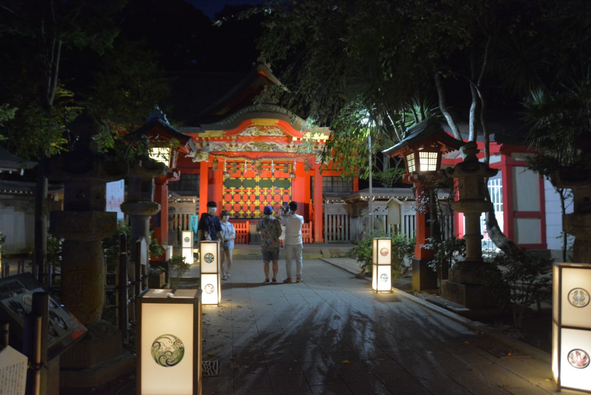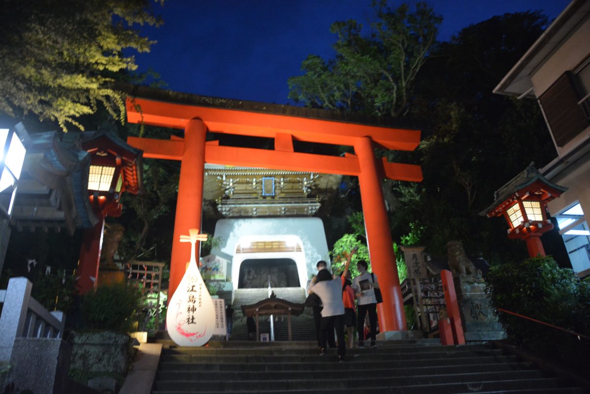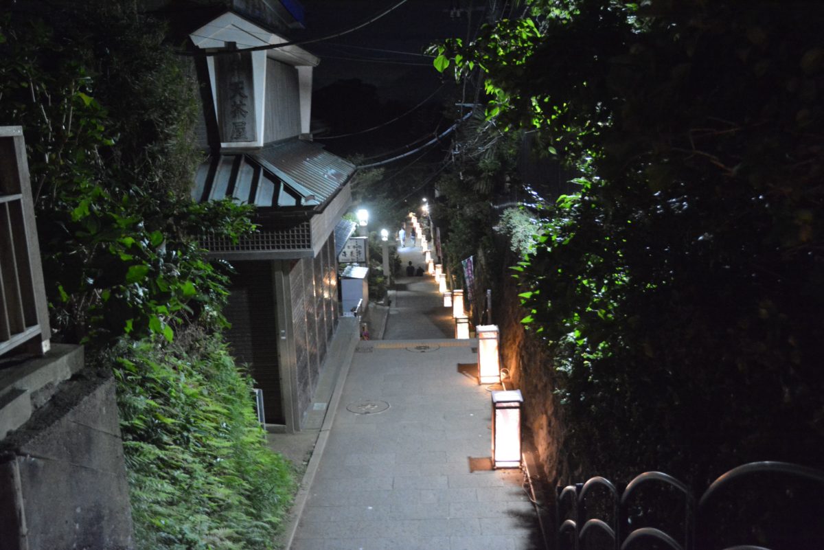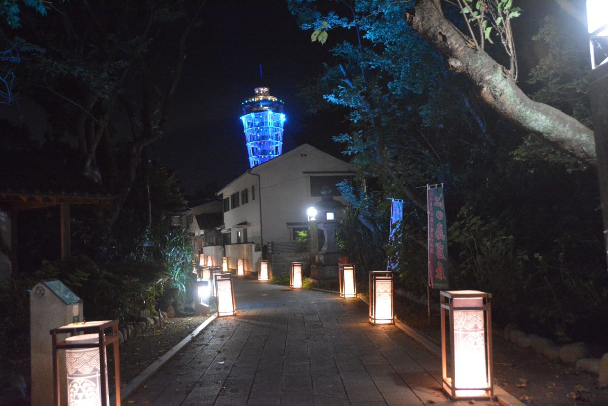 江島神社の中津宮から島の先端近くの奥津宮に向かう参道が灯篭に照らされると、静けさの中に和の情緒が漂います。