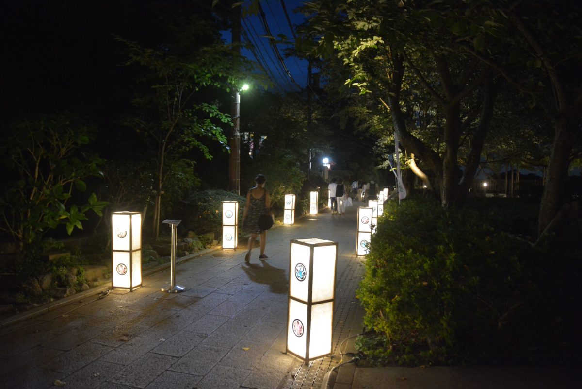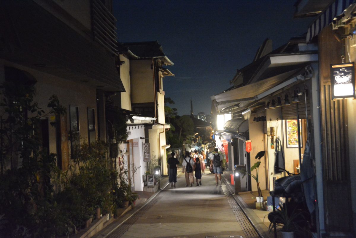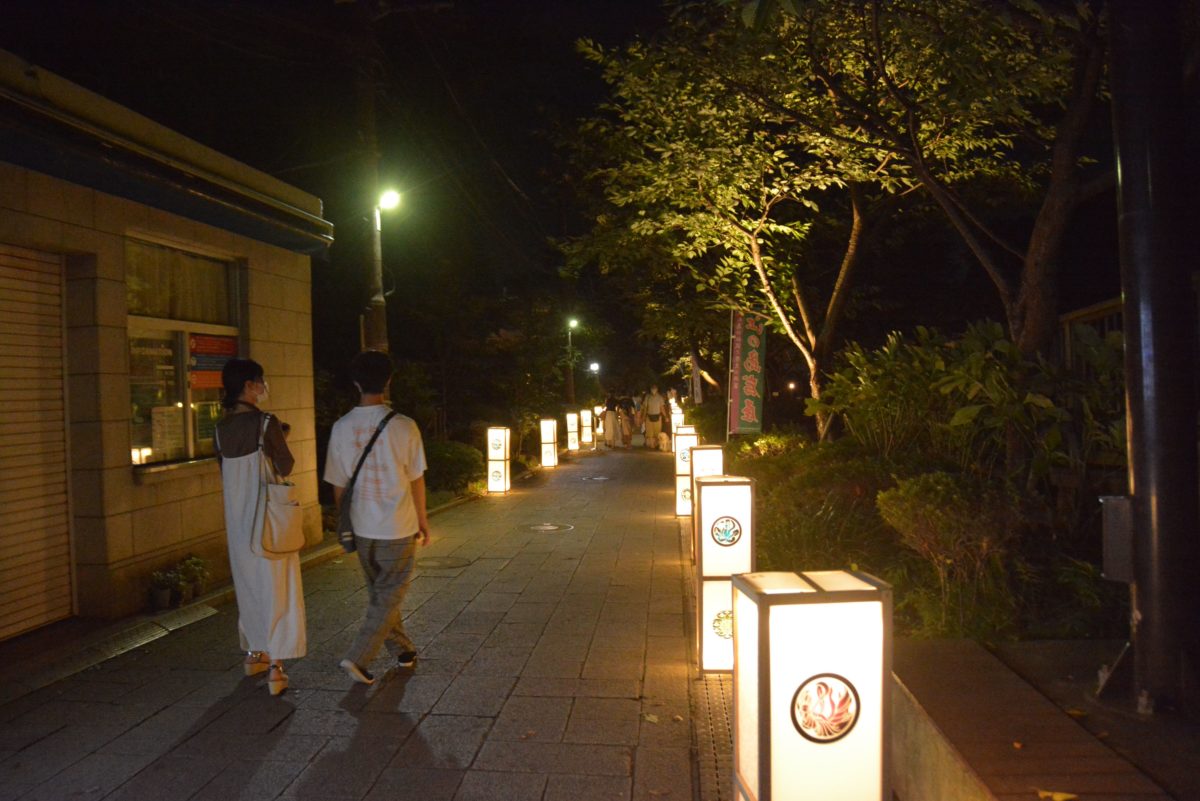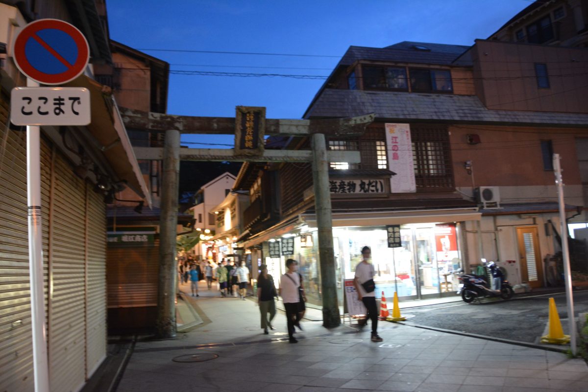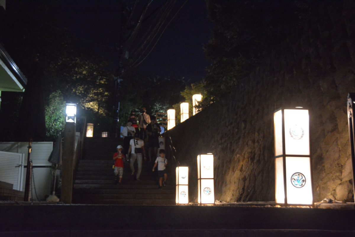 江島神社の中津宮から島の先端近くの奥津宮に向かう参道が灯篭に照らされると、静けさの中に和の情緒が漂います。