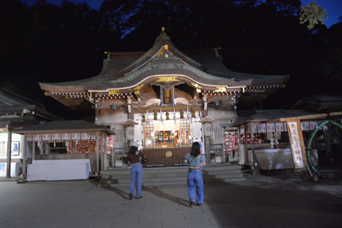 江島神社の辺津宮は、1206年に鎌倉幕府第3代将軍の源実朝が創建したと伝わります。権現造りの拝殿を構え、田寸津比賣命を祀っています。境内に敷かれた石畳の道を左右から灯篭の和かな光が照らします。