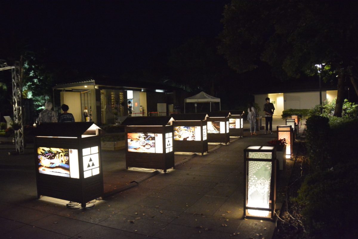サムエル・コッキング苑の入口広場の「天女と五頭龍」伝説をモチーフとした影絵灯籠
