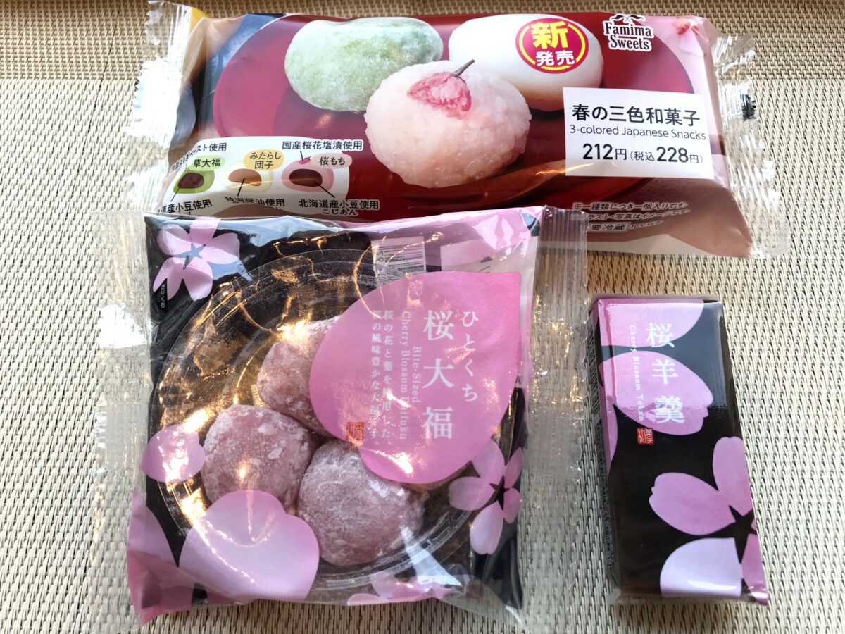 今回、ファミリーマートで購入したのは、写真真上から時計回りに・春の三色団子 228円(税込)・桜羊羹88円(税込) ・ひとくち桜大福 128円(税込) の3種。どれもクラシカルなザ・和菓子という感じで、和菓子が好きな人にとってはたまらないラインナップになっています。