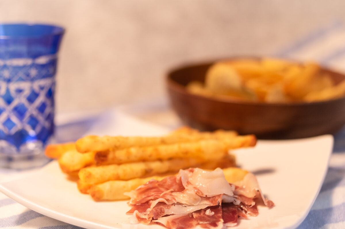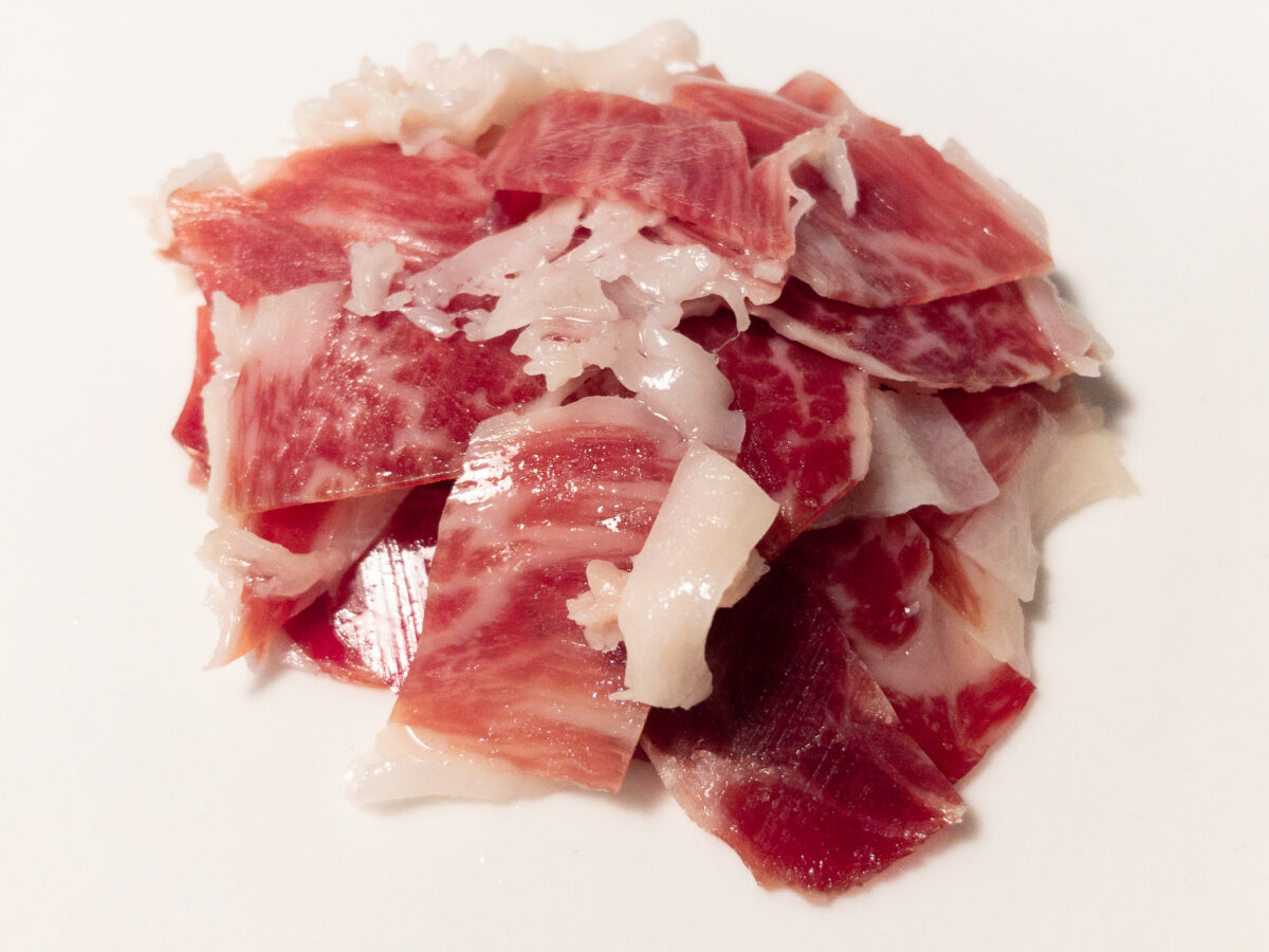 見た目は脂身が多く、近所のスーパーで売っている生ハムと比べると、やや厚みにカットされています。口に入れとジュワッとコクのある脂が溶け出し、口の中いっぱいに独特の香りが広がります。