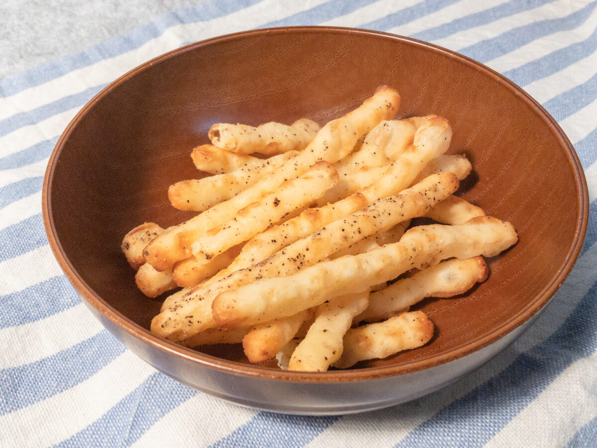 黒い粒々はブラックペッパー。このスパイシーなブラックペッパーと、オニオンフレーバーの芳醇なチーズの味わいは、ワインにピッタリ。写真ではサクサクとしているように見えますが、しっとりとした食感。2〜3分オーブントースターで焼くと、さらに美味しさがアップします。