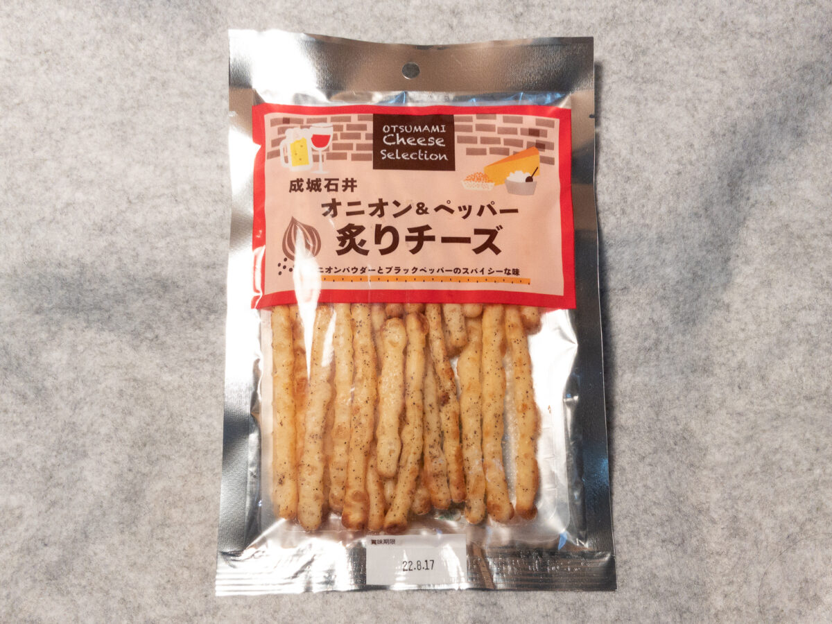 黒い粒々はブラックペッパー。このスパイシーなブラックペッパーと、オニオンフレーバーの芳醇なチーズの味わいは、ワインにピッタリ。写真ではサクサクとしているように見えますが、しっとりとした食感。2〜3分オーブントースターで焼くと、さらに美味しさがアップします。