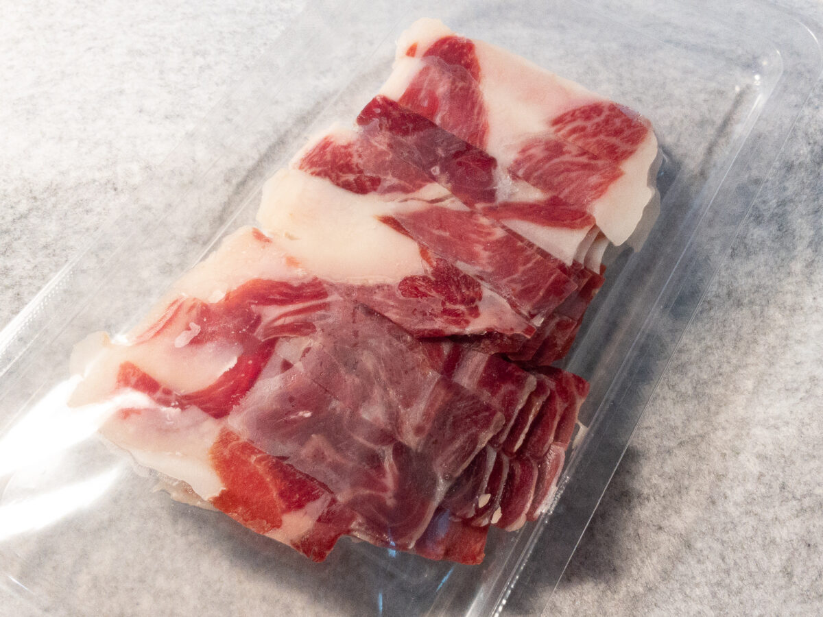 見た目は脂身が多く、近所のスーパーで売っている生ハムと比べると、やや厚みにカットされています。口に入れとジュワッとコクのある脂が溶け出し、口の中いっぱいに独特の香りが広がります。