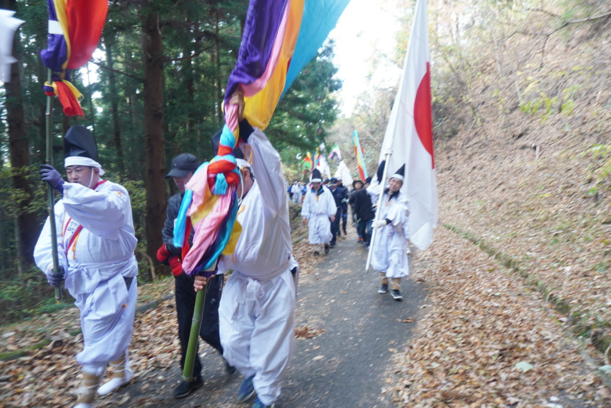 ……と喜んだのも束の間。何と山中の移動につき、旗は畳まれてしまいました。こ、これでは絵にならない。なるほど。カメラマンが激減したのはこのためか! ま、いいや。どうせこんな儀式なんて形だけでしょ。山登りなんてすぐ終わるよね(舐めプ)。