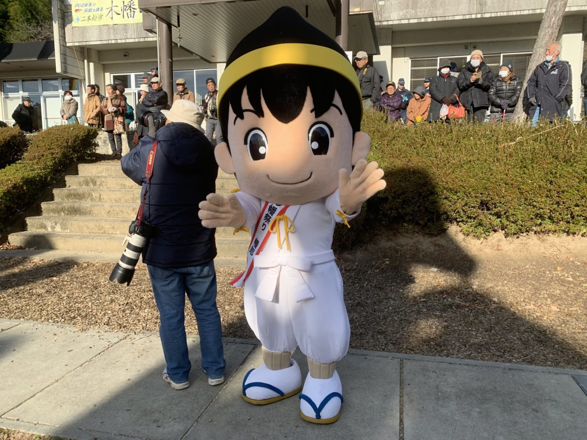 二本松駅からバスで約40分。そこからさらにタクシーを乗り継いで出立式会場に到着。現地にはイメージキャラクターの「幡郎」も来ていました。