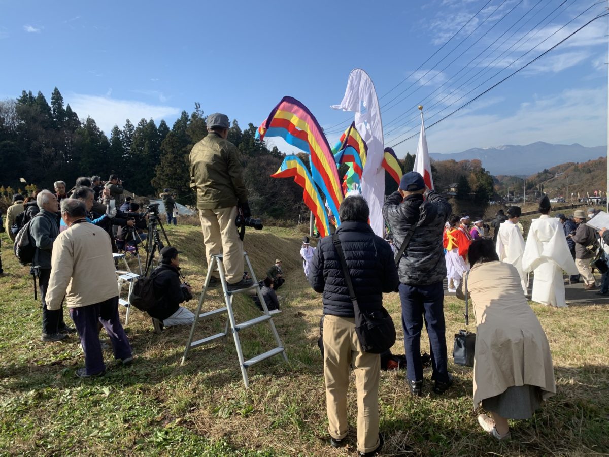 里山風景に映える五色の幡。一瞬のシャッター・チャンスをねらって、大勢のカメラマンたちが縦横無尽に蠢きます。