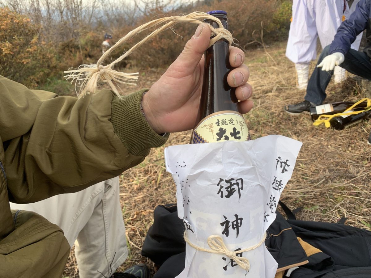 「御神酒」と書かれた一升瓶を縄で縛ってワイルドに運ぶスタイルが「かっこよ!」と思って写真を撮っていると「兄ちゃんも飲むかい?」と薦められました。地元の酒造、大七酒造の大七。「ぷっは~」。慣れない運動で疲弊した体に酒が染み込んでいきます。