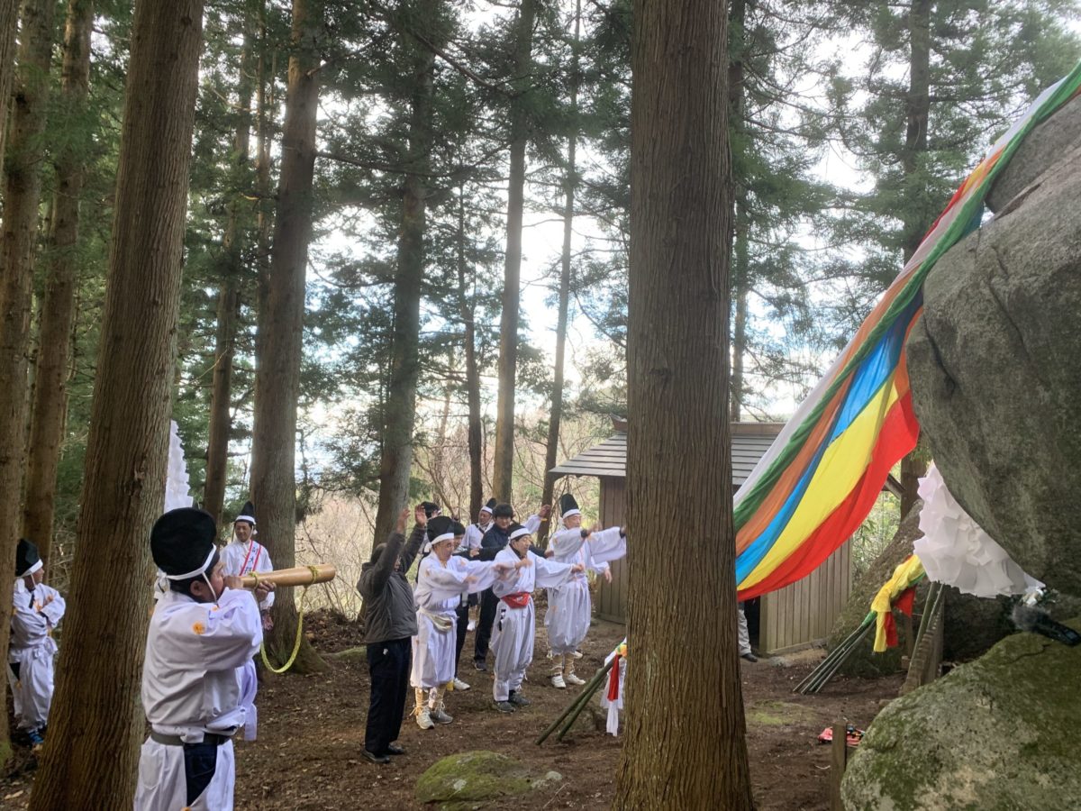 この後、彼らは別動隊について裏参道を通って大岩(胎内くぐり岩)に到着。大岩の割れ目を抜ける「胎内くぐり」の行事を行います(※残念ながら今回の取材では撮影できませんでした)。この儀式を経て初めて彼らは共同体の中で一人前となるのです。山全体をひとつの母体と見なすような発想が興味深いですよね。