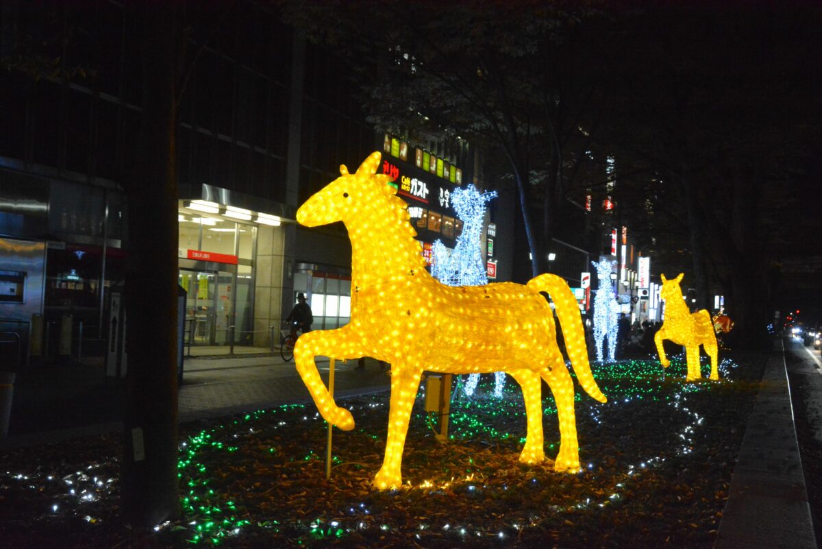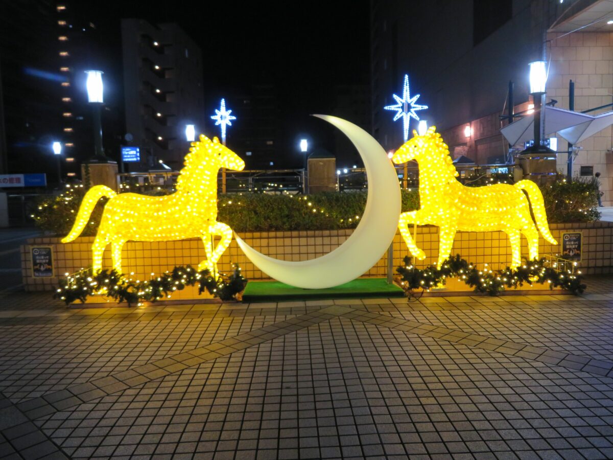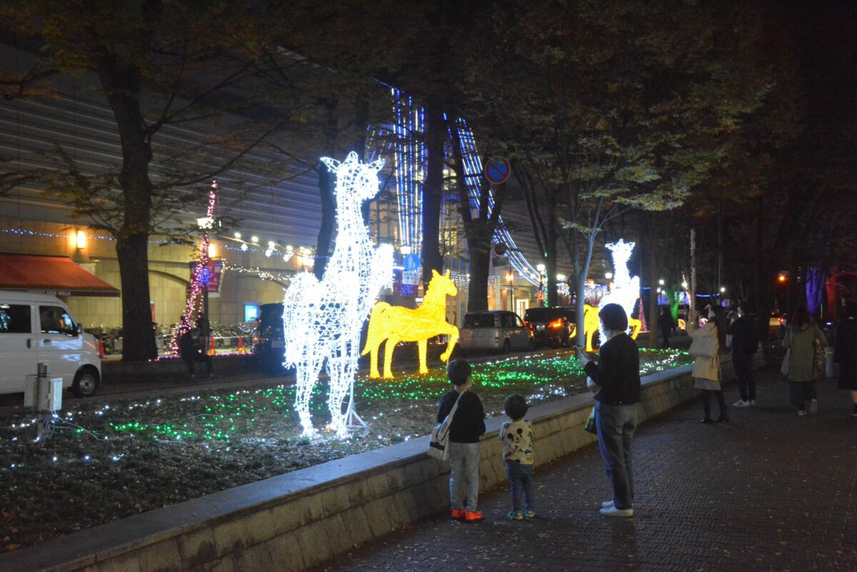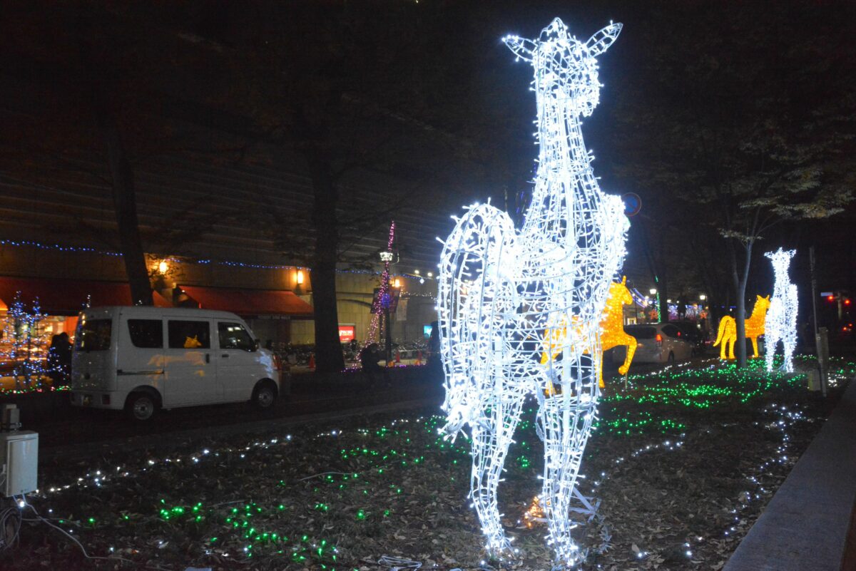 「けやき並木」では、江戸時代の安政年間頃まで馬市が立っていました。通りでは馬をモチーフにしたイルミネーションを数多く見ることができます。「ウマイルでスマイル」となることでしょう。