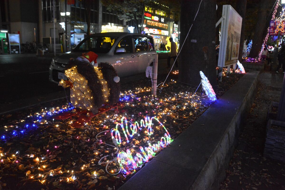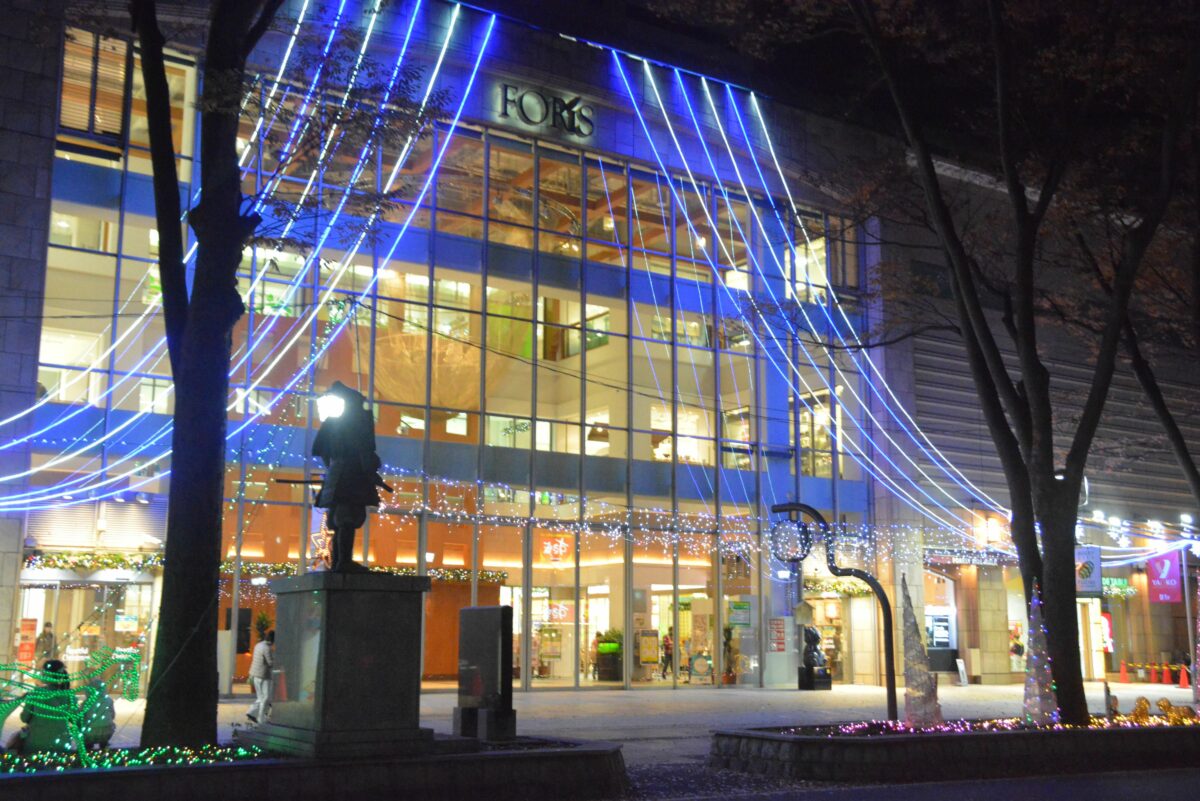 「けやき並木」の中央にはショッピングセンターのフォーリスが玄関を構え、前にはクリスマスの雰囲気を盛り上げるオブジェが飾られています。
