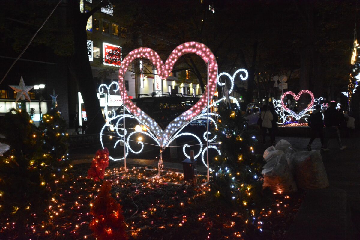 他にも、歩道の路面に映し出される「府中けやき並木イルミネーション」の文字や、ハート形のフォトスポットなど、多彩なアイデアの光の演出が施されています。