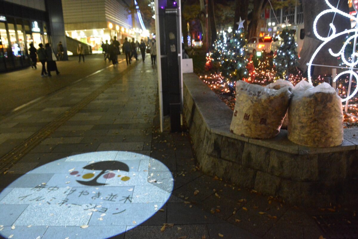 歩道の路面に映し出される「府中けやき並木イルミネーション」の文字