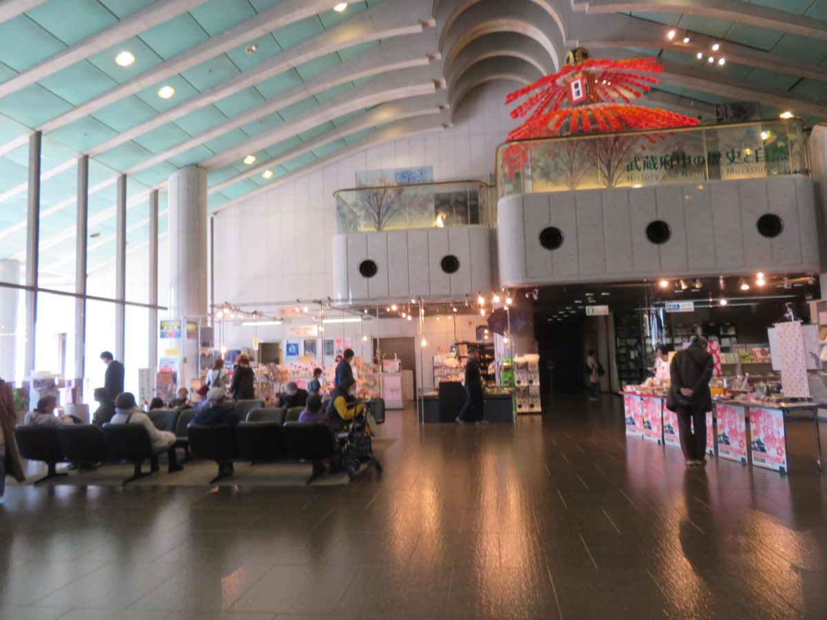 正門を入ると、博物館本館の正面です。本館内の常設展示では、府中の歴史や文化を紹介しています。おまつり期間中にはロビーで梅関連商品が販売され、玄関には露店も登場します。