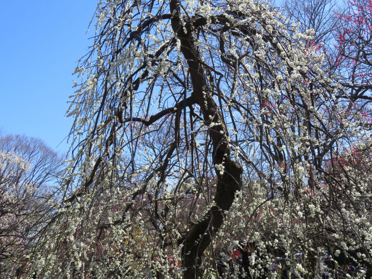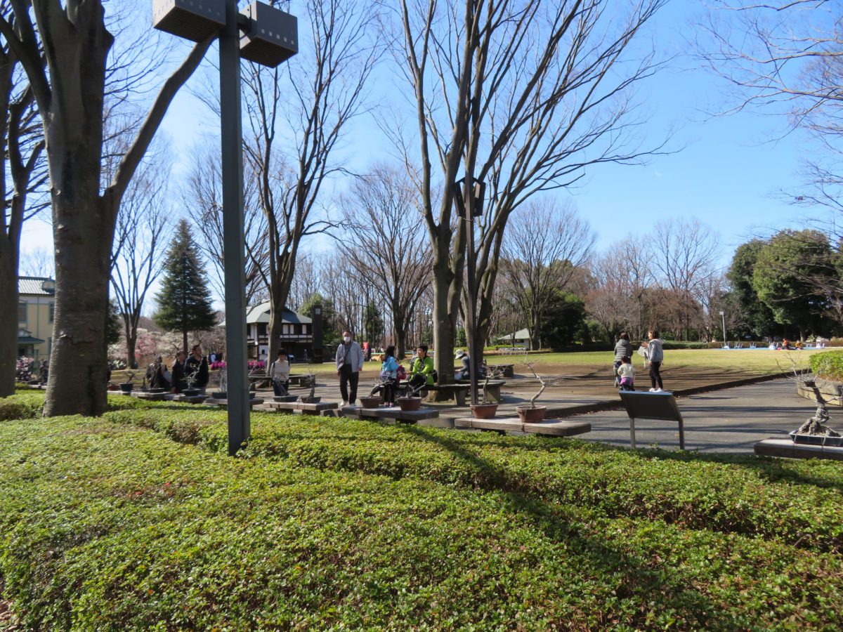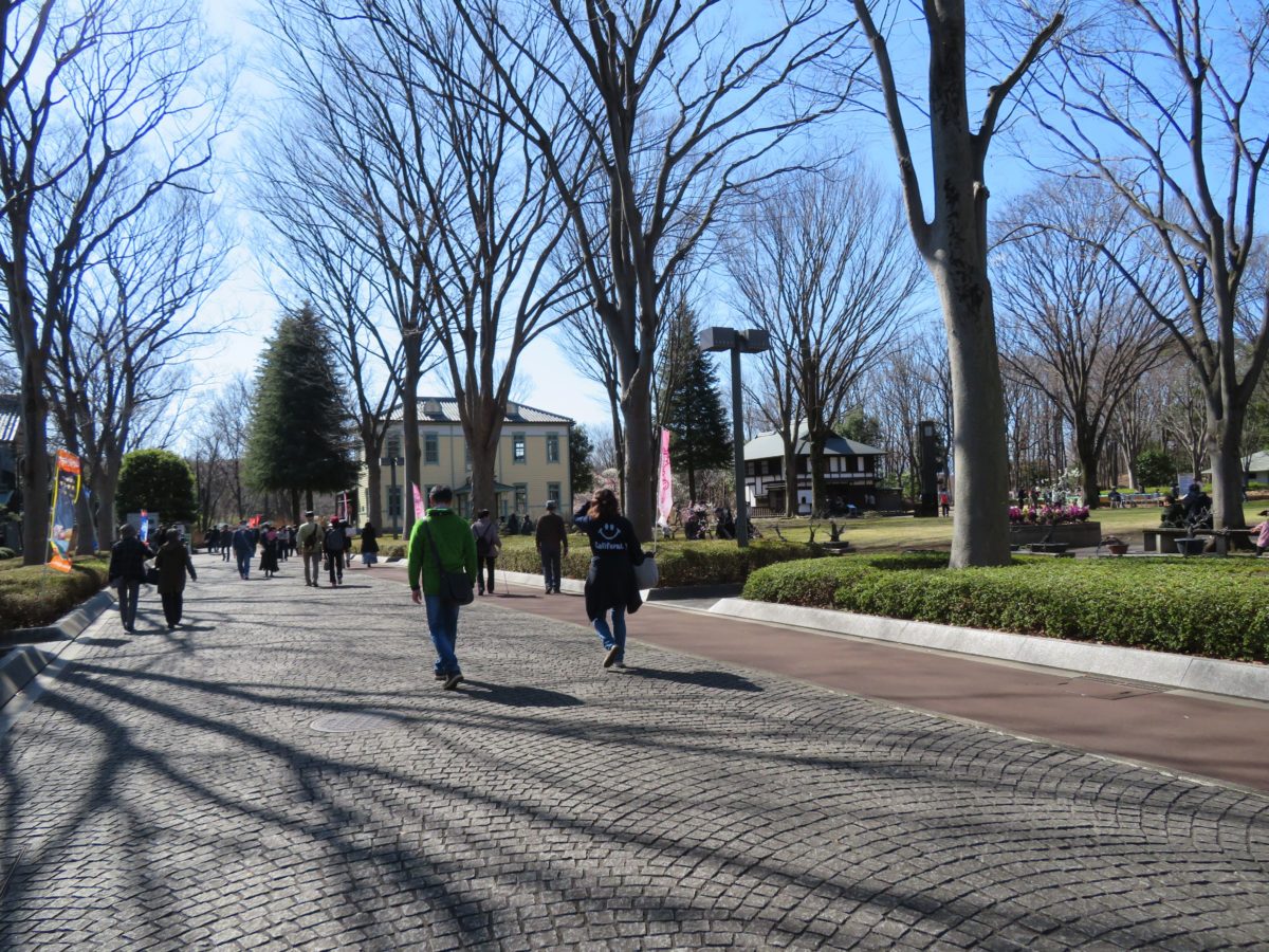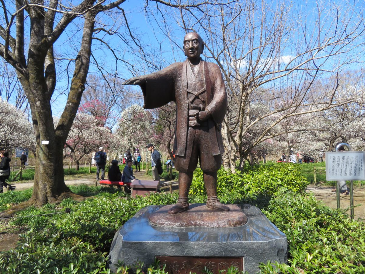 けやき並木を進むと、江戸時代の元禄年間に府中で新田開発や多摩川の治水に携わった川崎平右衛門の像が立てられています。背後には紅白の梅が名主の偉業を讃えているかのようです。平右衛門広場の中には銘木も数多く、太宰府天満宮から送られてきた「鹿児島紅梅」や「大和牡丹」の他にも、「月影枝垂」、「思いのまま」などの前では、立ち止まってしまいます。