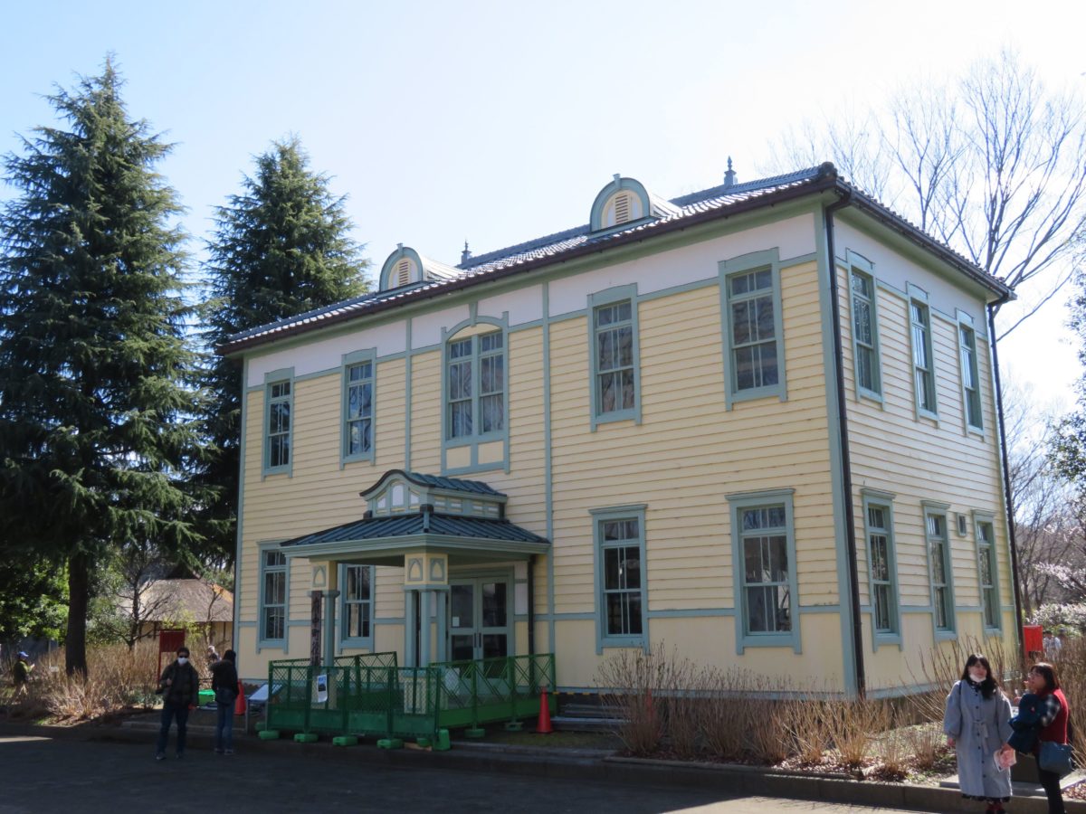 郷土の森博物館の敷地内では、多種多様の草木が植栽されていますが、歴史的な建物物などが移築されていることも大きな特徴です。芝生広場の南に面して建つ旧府中町役場庁舎、旧府中郵便取扱所に府中の歴史を感じることができます。2つの建造物の南にも梅の花が初春の雰囲気を漂わせています。
