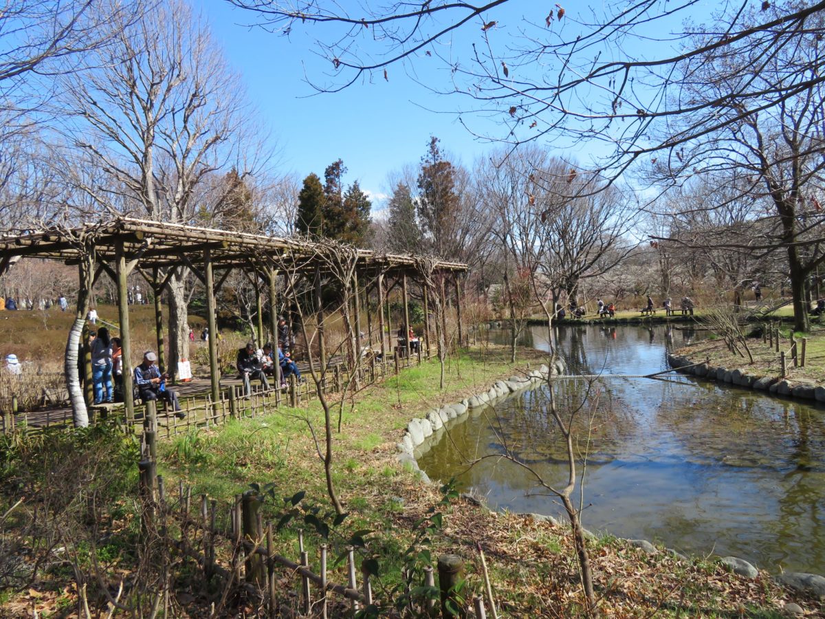 芝生広場の南西エリアでは、江戸時代後期1829年に創建された旧三岡家長屋門が、「紅千鳥」で彩られます。他にも「臥龍梅」が扇を広げたような姿を見せています。梅の銘木が育つ中には、やすらぎの池が静かに水を湛えています。