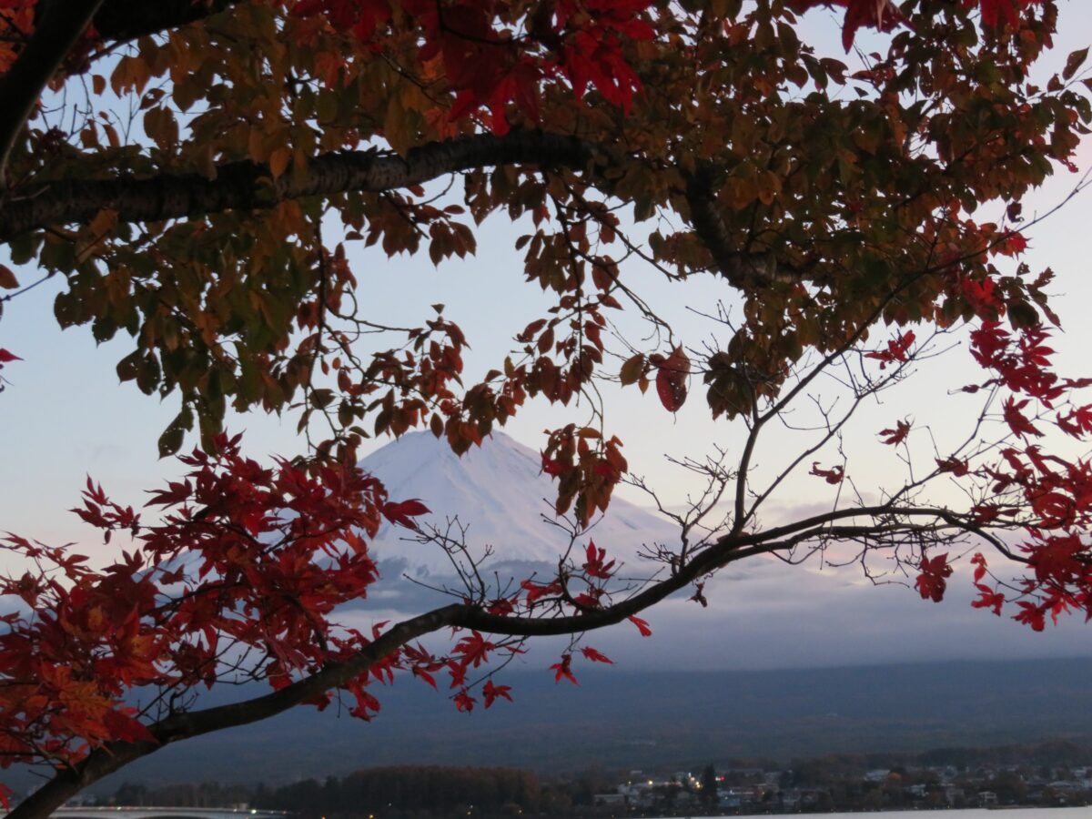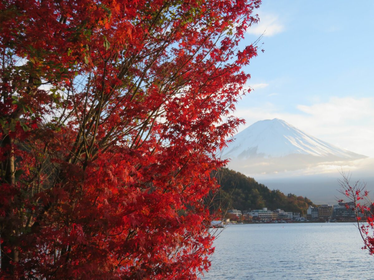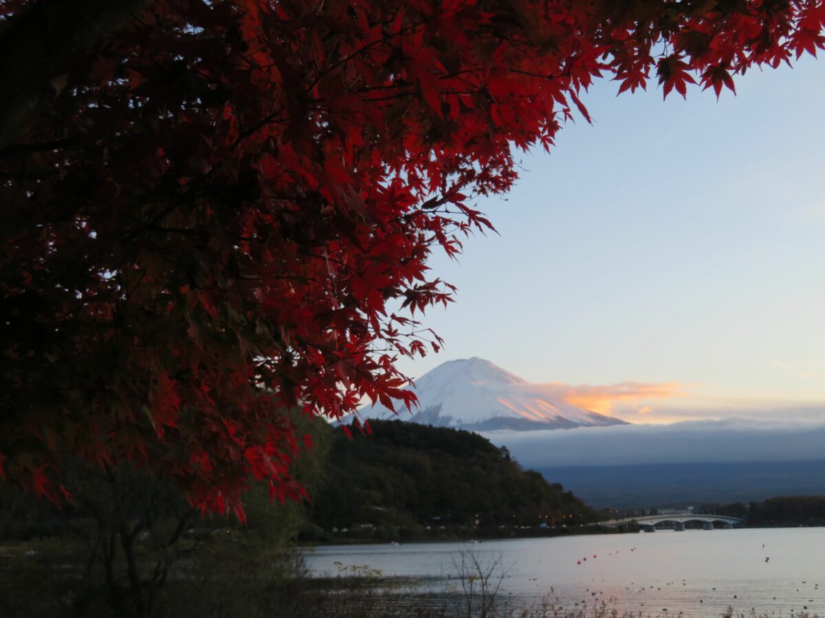 日本で最も高い山は富士山です。江戸時代中期の1707年の宝永大噴火以来、火山活動は行っていませんが、何度となく噴火を繰り返しました。山麓には5つの堰止湖が誕生し富士五湖と呼ばれています。この中で最も北に位置するのが河口湖です。河口湖の周辺は富士五湖の中でも、いち早く観光開発され一年を通して大勢の観光客が訪れています。四季折々の風景に恵まれ、例年10月下旬から11月下旬には紅葉で彩られ、「富士河口湖紅葉まつり」が開催されます。2021年は10月30日~11月23日の期間で行われています。
