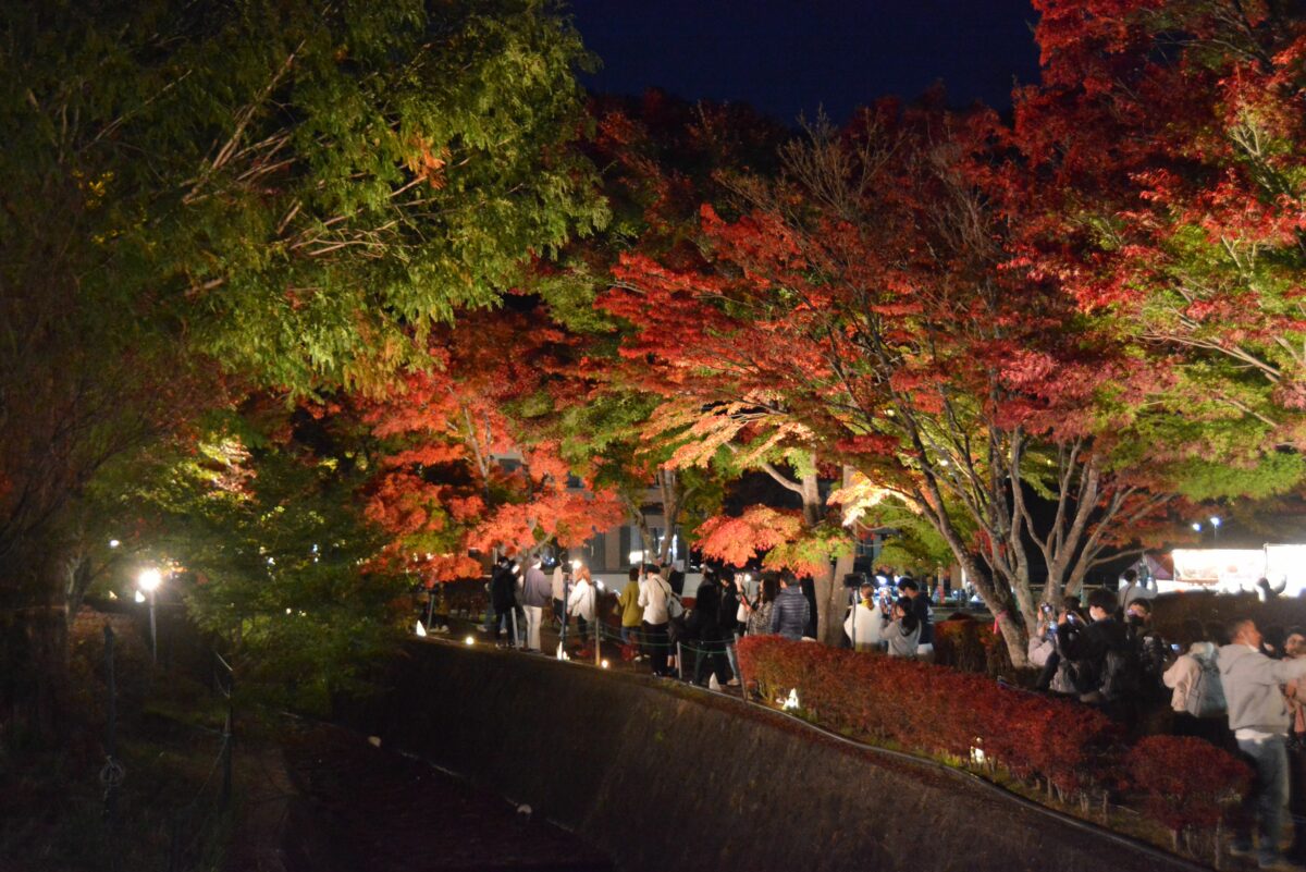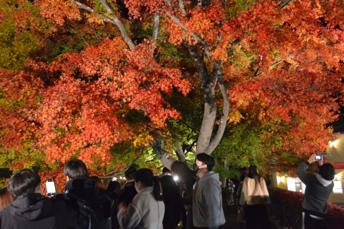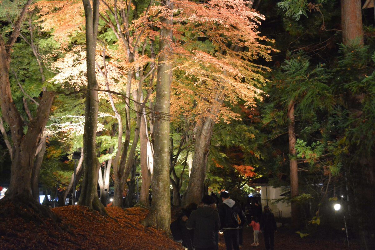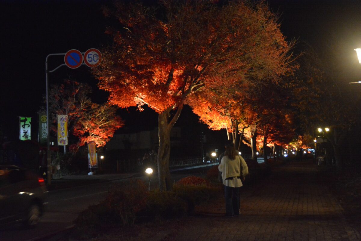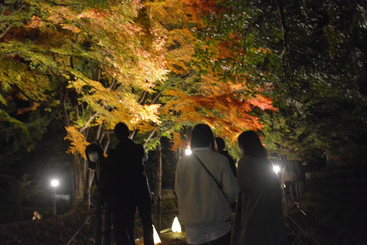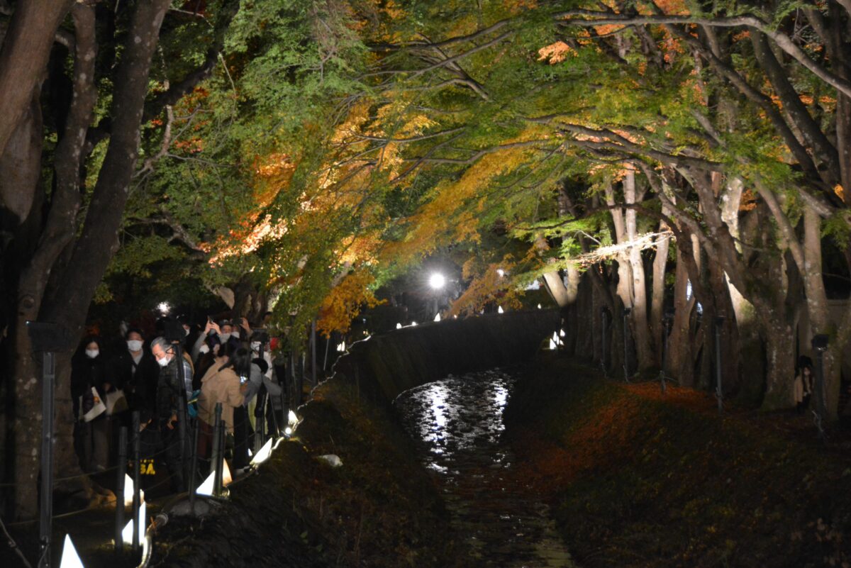 「もみじ街道」に変身しライトアップされる「御坂みち」