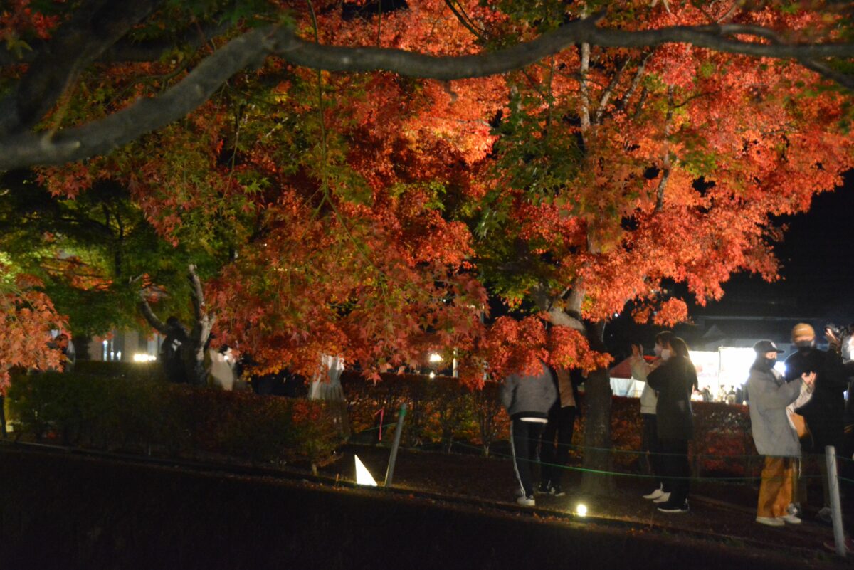 夕陽が沈んだ後にライトアップされる「もみじ回廊」