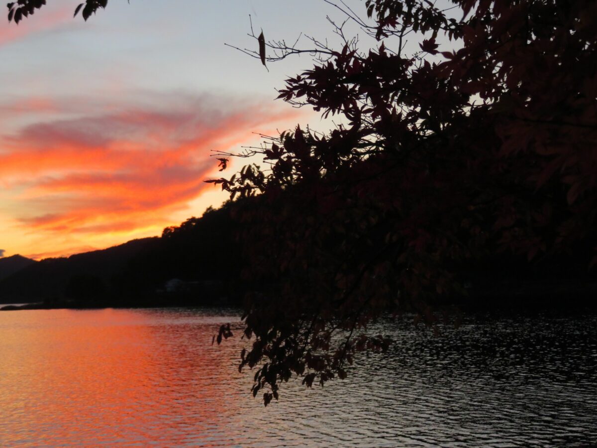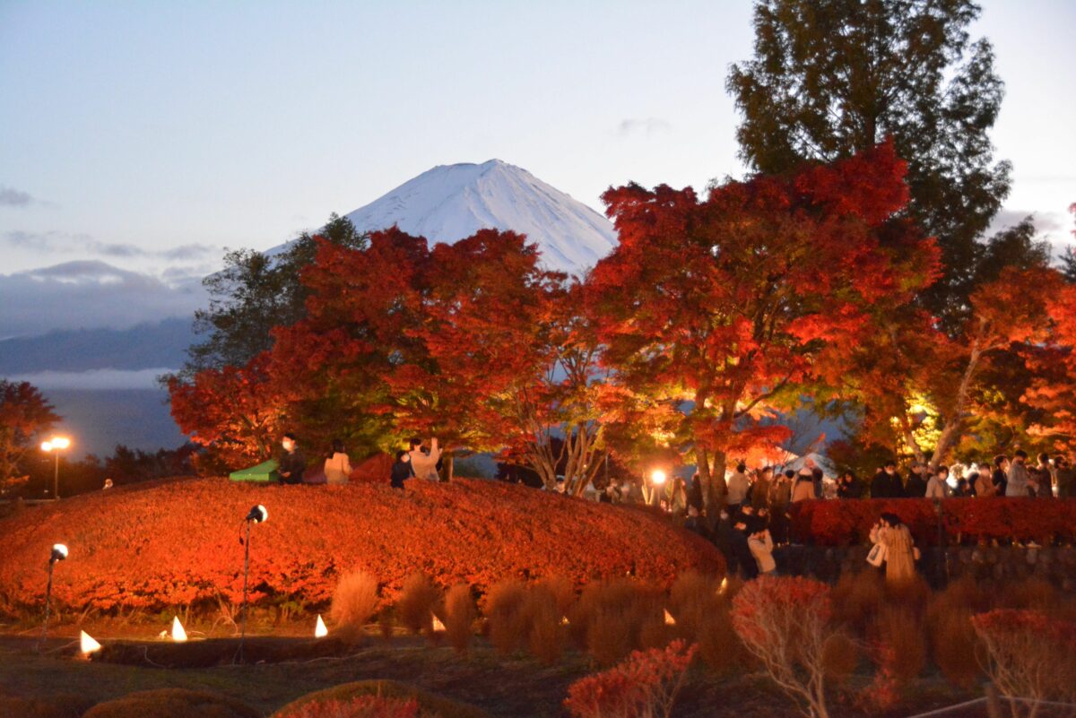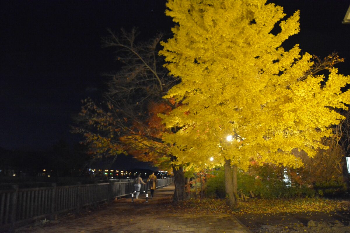 夕陽が沈むと河口湖円形ホールの北東の「もみじ回廊」がライトアップされます。60本前後の巨木のモミジが約1.5キロの並木を作っており、和かな光で紅葉が夜空に浮かび上がるのです。